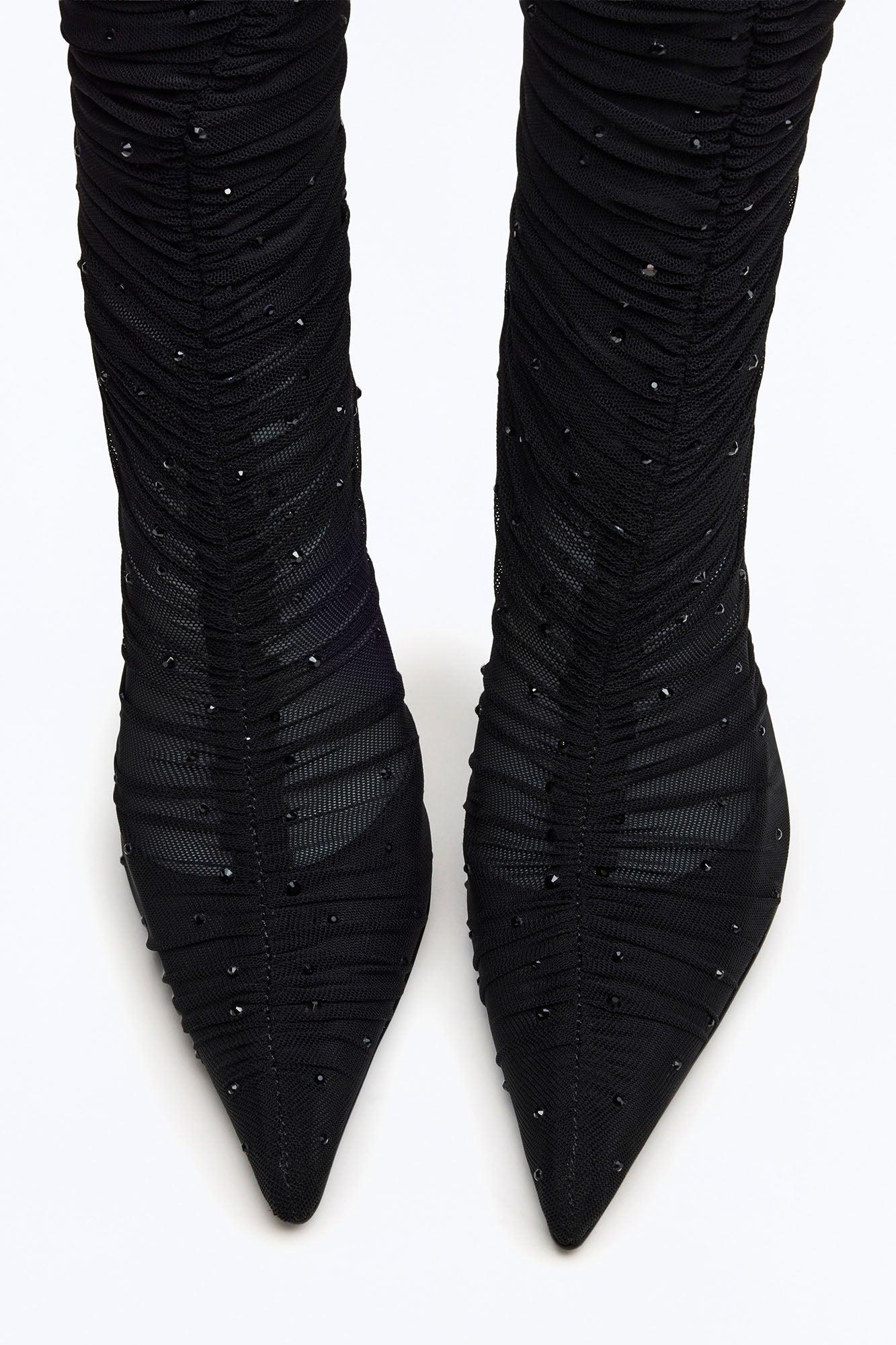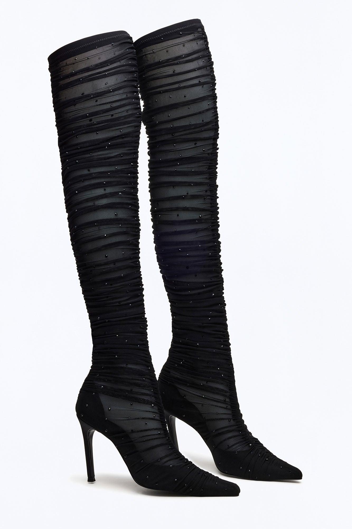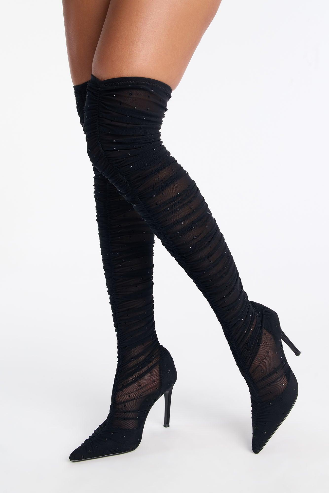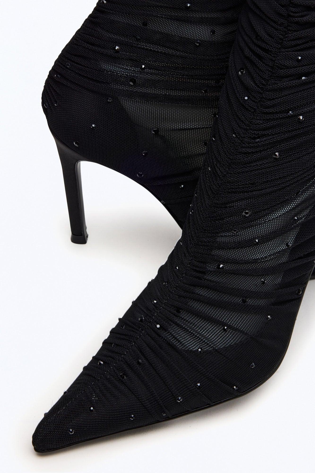 Available In Black. 4 inch heel height 14.5 inch shaft circumference 23 inch shaft height Textile upper material with stones Unlined Synthetic sock Synthetic sole Disclaimer: Rhinestone Placement Will Vary. Imported