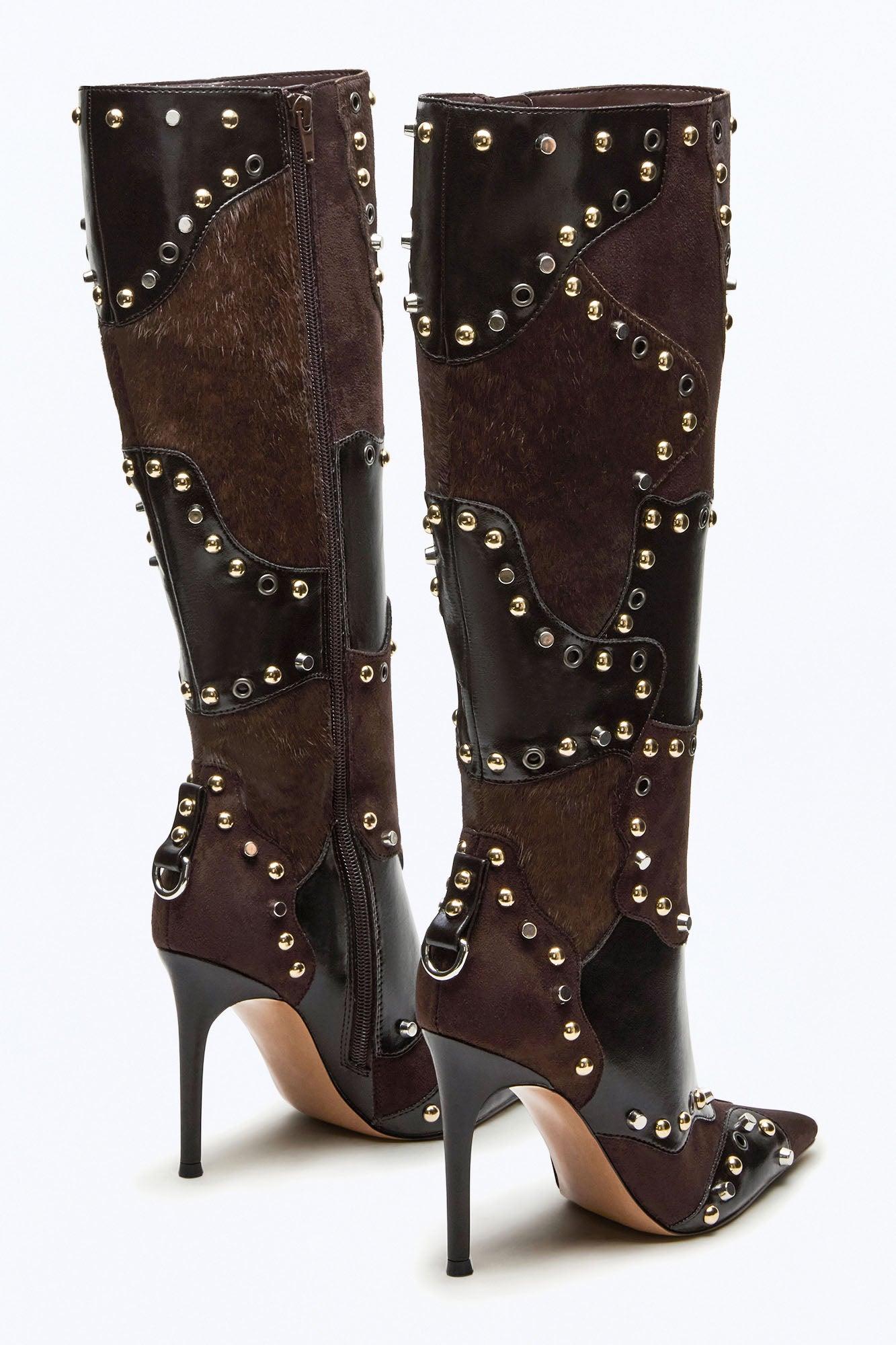 Available In Brown Combo. 3.75 inch heel height Size 6 measurements: 14.06 inch shaft circumference,14.5 inch shaft height Size 8 measurements: 15 inch shaft circumference, 15 inch shaft height Size 10 measurements: 15.94 inch shaft circumference, 16 inch shaft height For correct calf measurements, measure your bare calf at its widest circumference with your foot flat on the ground Leather, microsuede, and synthetic upper material with hardware Textile and synthetic lining Synthetic sock Synthetic sole Imported