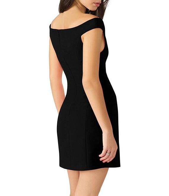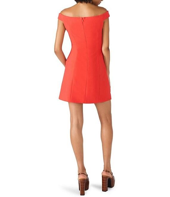 From Steve Madden, this Yana dress features: Woven Fabrication Fit & Flare Silhouette Off-the-Shoulder Cap Sleeves 2 Front Slit Pockets Lined Mini Zipper on Back Approx. 29" Length Polyester/Rayon/Spandex; Lining Polyester/Elastane Dry Clean Only Imported.