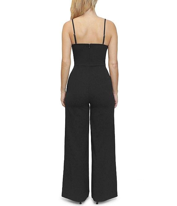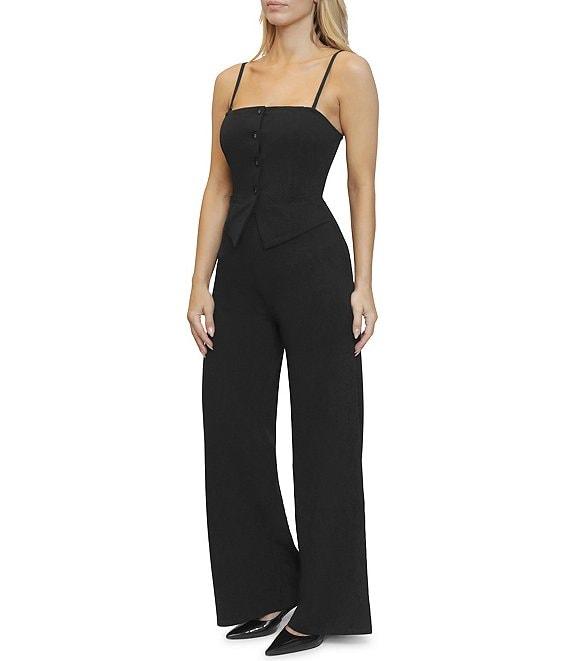 From Stevie By Steve Madden, this jumpsuit features: Solid knit dobby fabric Straight neckline Sleeveless Removable adjustable straps Invisible zipper at center back Welt pockets Button-up front Polyester/spandex Machine wash/tumble dry Imported.