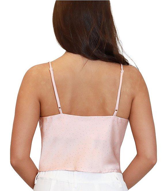 From Stevie by Steve Madden, this top features: Woven satin fabric with heat stones Cowl neckline Sleeveless Adjustable spaghetti straps Pullover styling Polyester Hand wash/flat dry Imported.