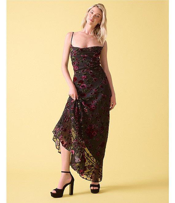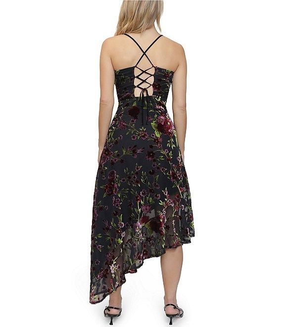 From Stevie by Steve Madden, this dress features: Velvet Burnout printed fabric Cowl neckline Sleeveless Spaghetti straps Lace-up back and invisible zip closure Asymmetrical hem Midi length Rayon/nylon Machine wash/tumble dry Imported.