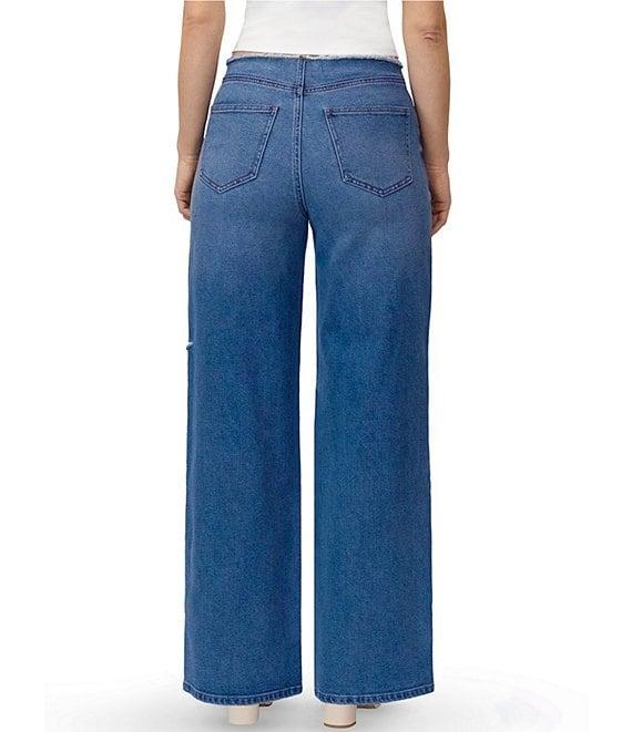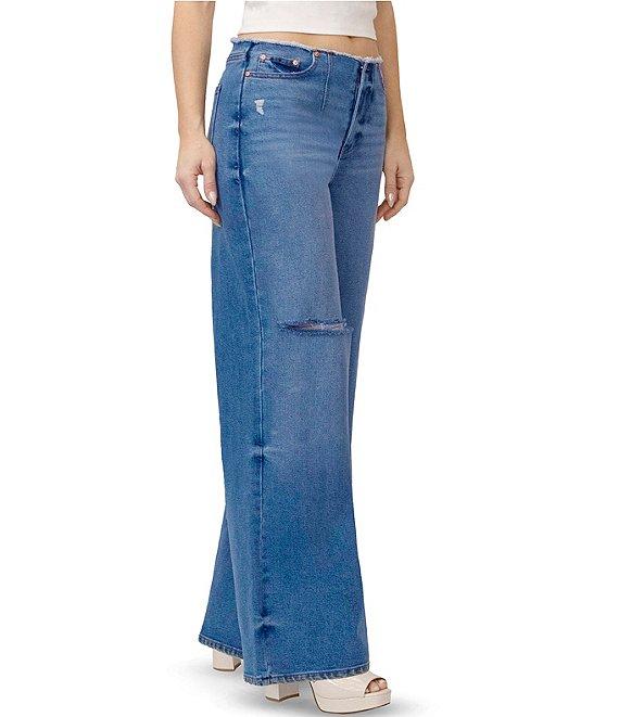 From Stevie Jeans, these jeans feature: 10.25" Mid rise Zip front closure 5-pocket styling Frayed waist Relaxed straight Approx. 31" inseam Wide legs Cotton/polyester/spandex Machine wash/tumble dry Imported.