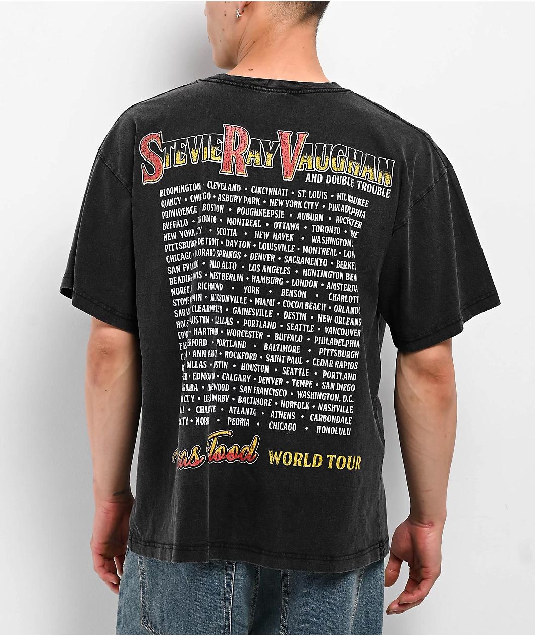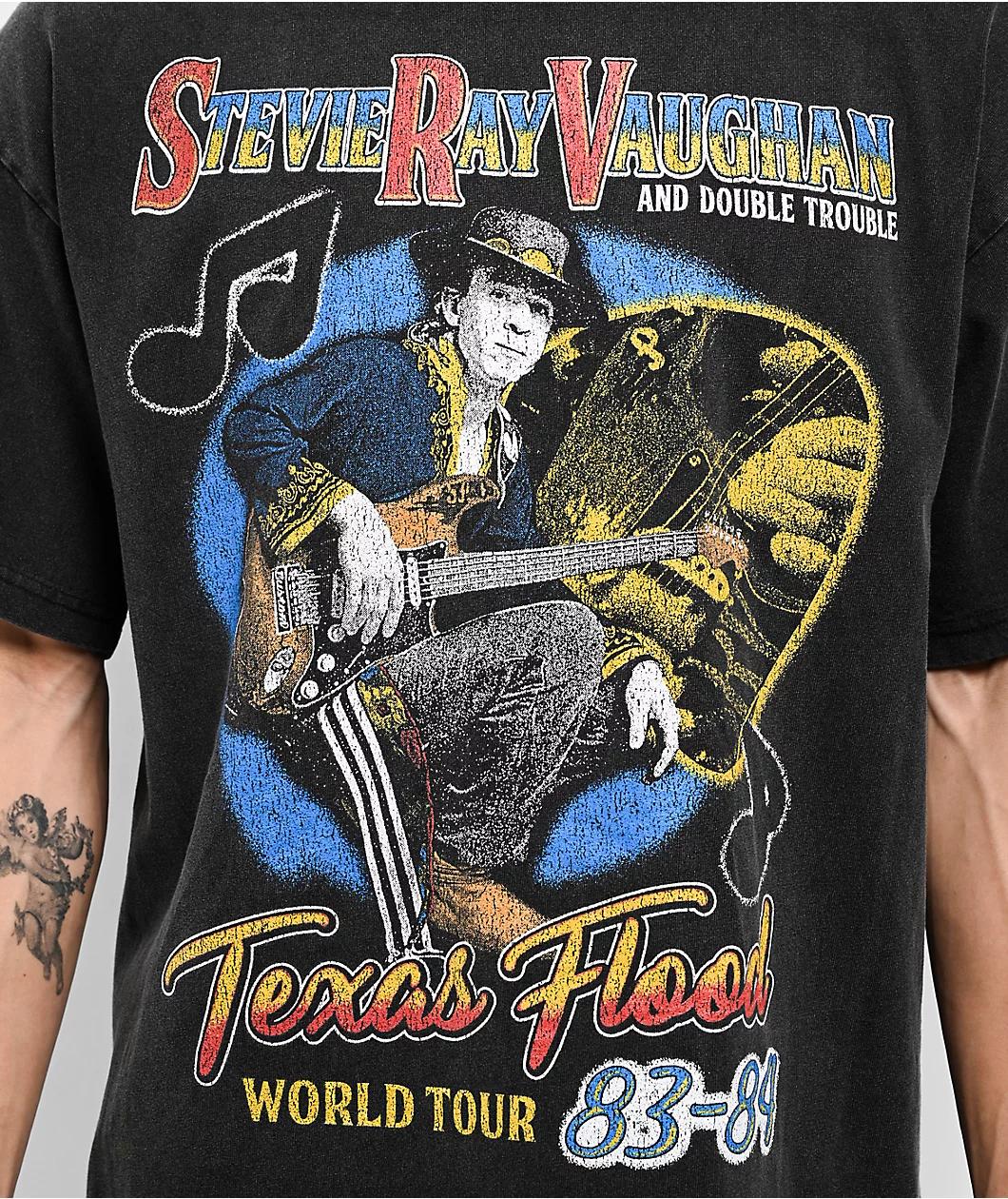 Commemorating a world tour in 1983, the Texas Flood t-shirt from Stevie Ray Vaughn arrives in a solid black cotton build with a washed treatment and distressed graphics to look authentically vintage. The classic rock musician is displayed prominently