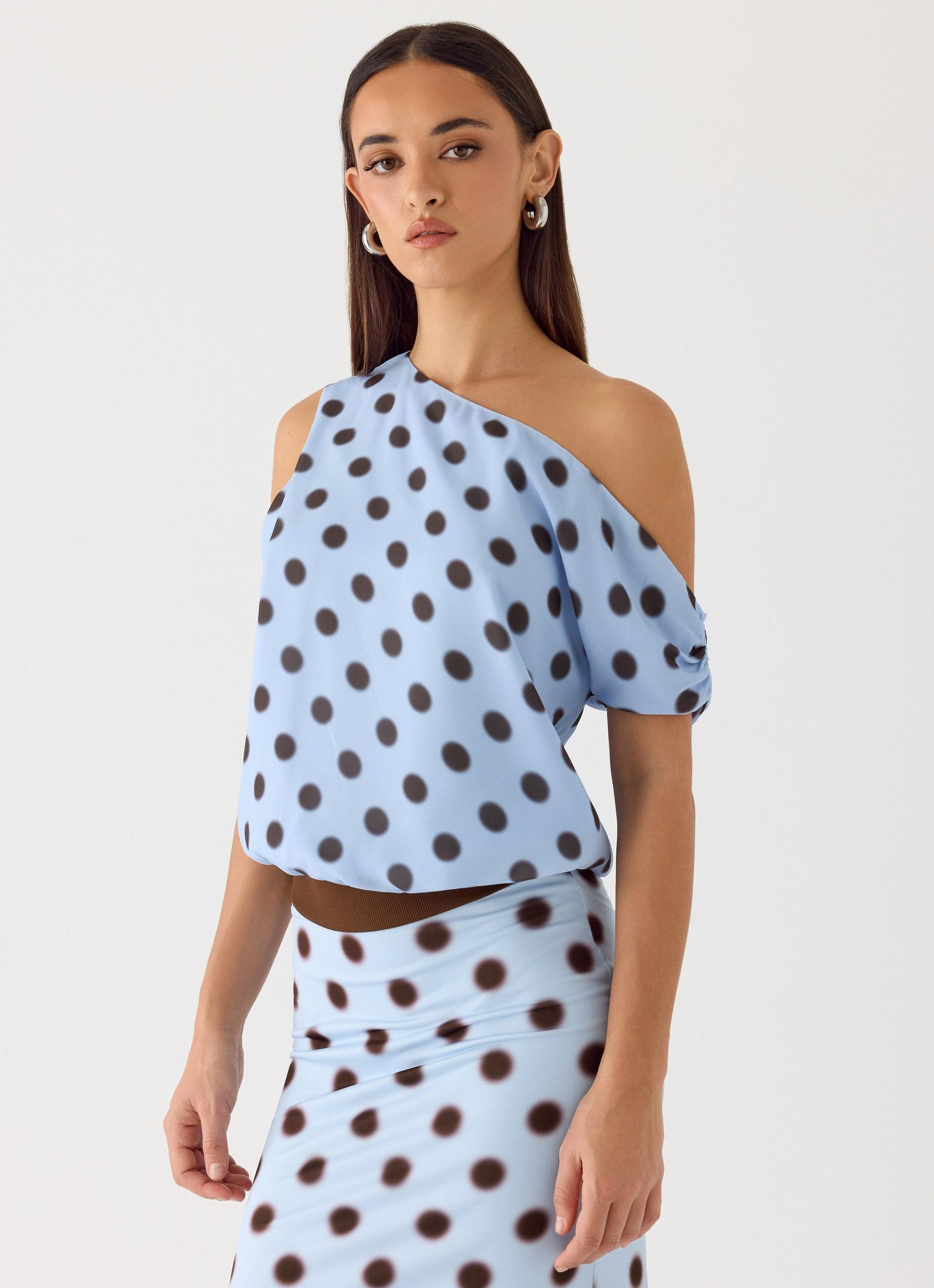 Peppermayo Exclusive The Stick Around Top is made for evenings that move effortlessly from golden hour to nightfall. Featuring an asymmetrical off-shoulder design and blouson fit, this style combines a soft, flowing body with a stretch waistband for a flattering silhouette. Fully lined and cut in lightweight chiffon, it’s an editorial-ready piece for confident, playful nights. - Asymmetrical off-shoulder- Blouson body fit with stretch waistband- Fully lined- Exclusive print (print placement may differ)- Fabric: Main: 100% Polyester, Lining: 100% Polyester Size AU 8 / US 4 garment measurements:Bust: 102 cm / 40.16 inWaist: 71 cm / 27.95 inHem: 69 cm / 27.17 inLength: 60 cm / 23.62 in Roberta is 177cm and wears size AU 6 / size US 2