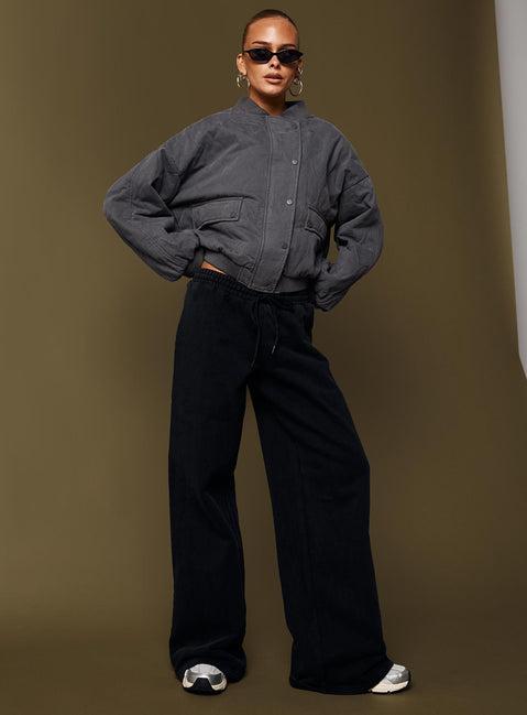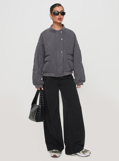 Quilted material, button & zip fastening, two front pockets, ribbed at neckline, hem & cuffs, balloon long sleeves