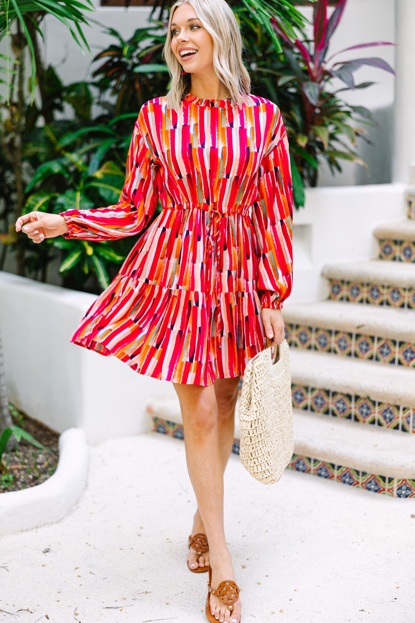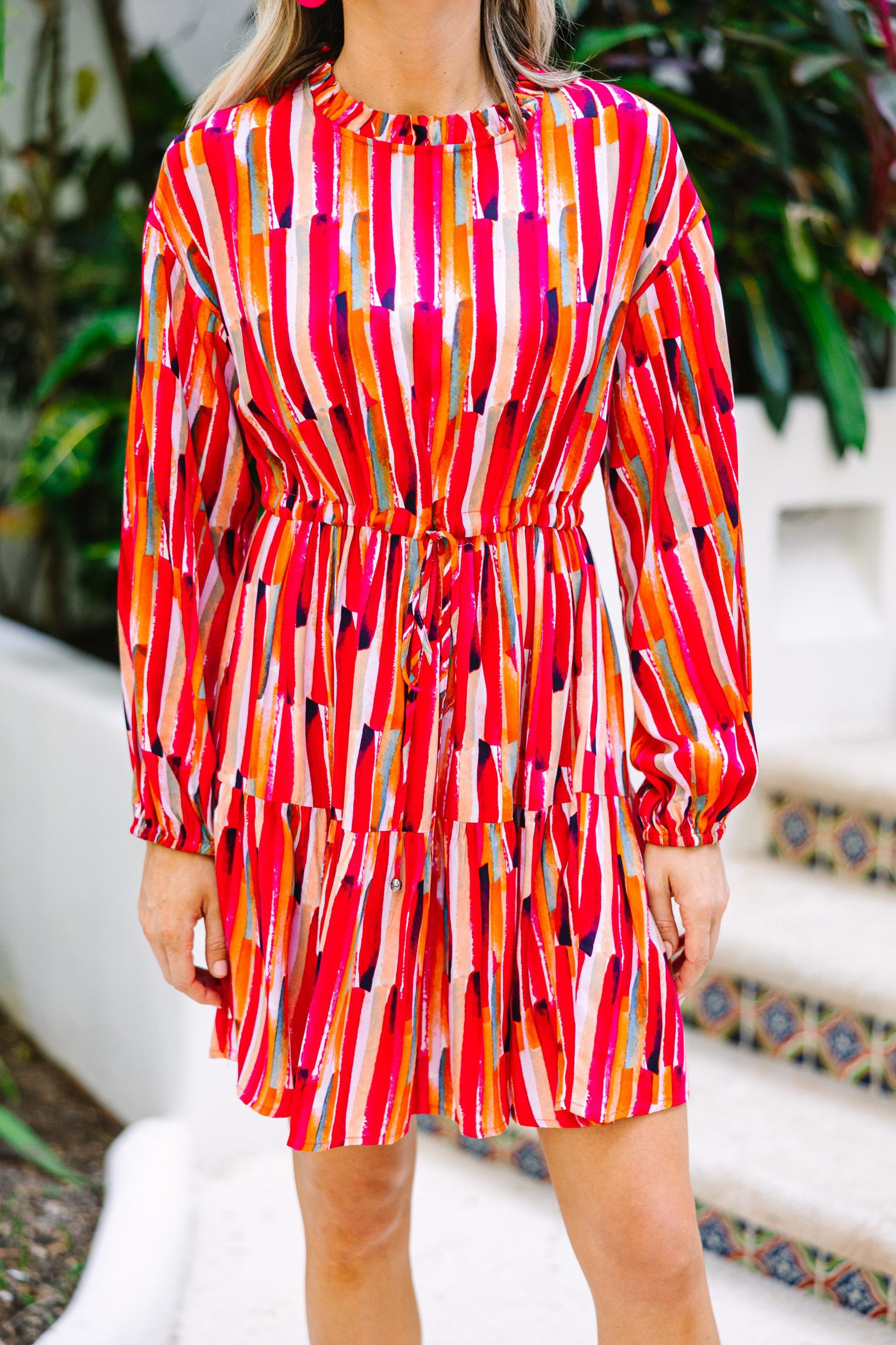 Look beautiful in this Stick With It abstract dress! This ruby red dress features an eye-catching abstract print and is designed with a flattering cut that makes a statement. Perfect for your next special event! This dress features long sleeves, a round neckline, tied waist, and a fun abstract print. Material has no amount of stretch.Cam is wearing the small.