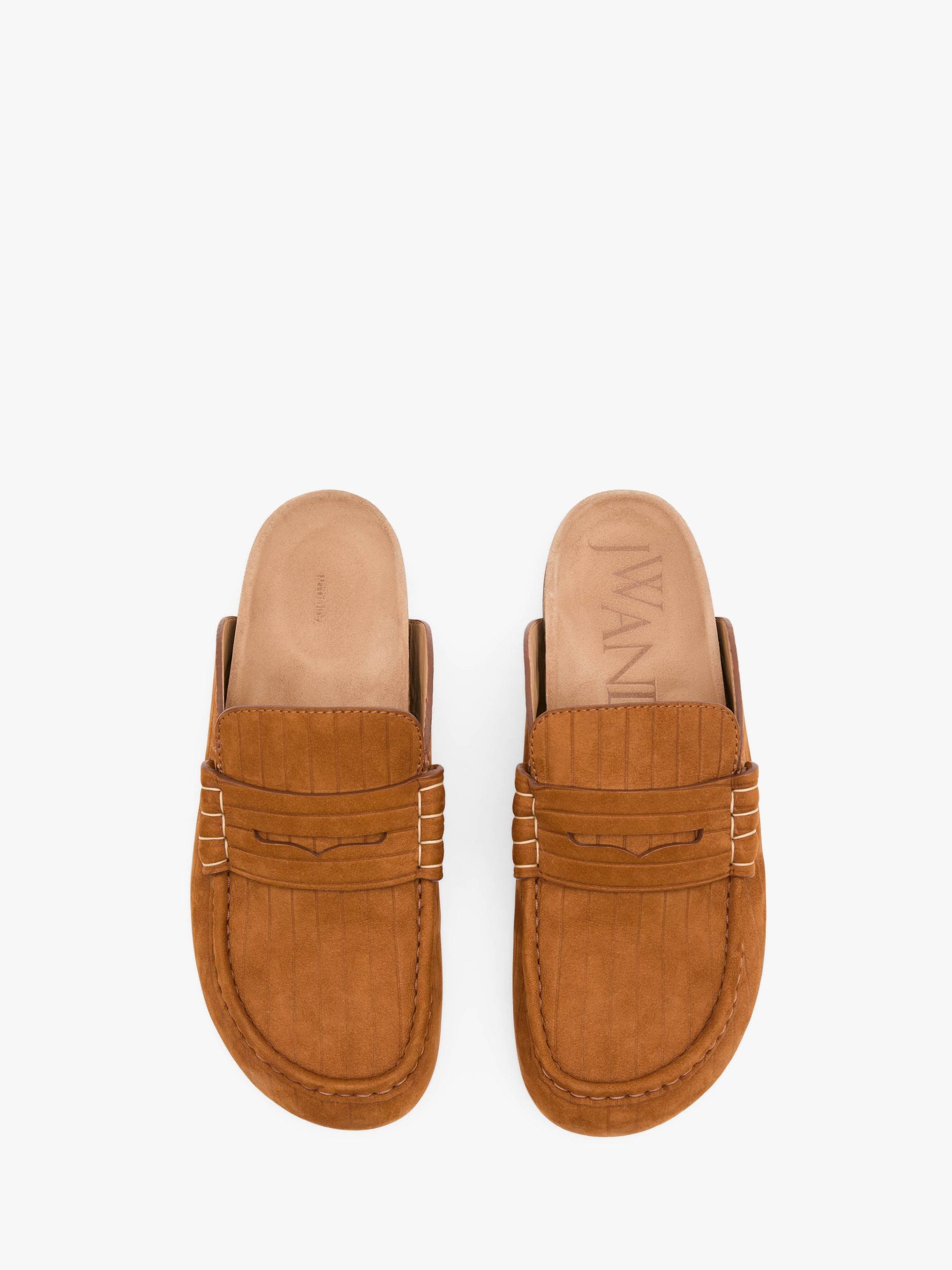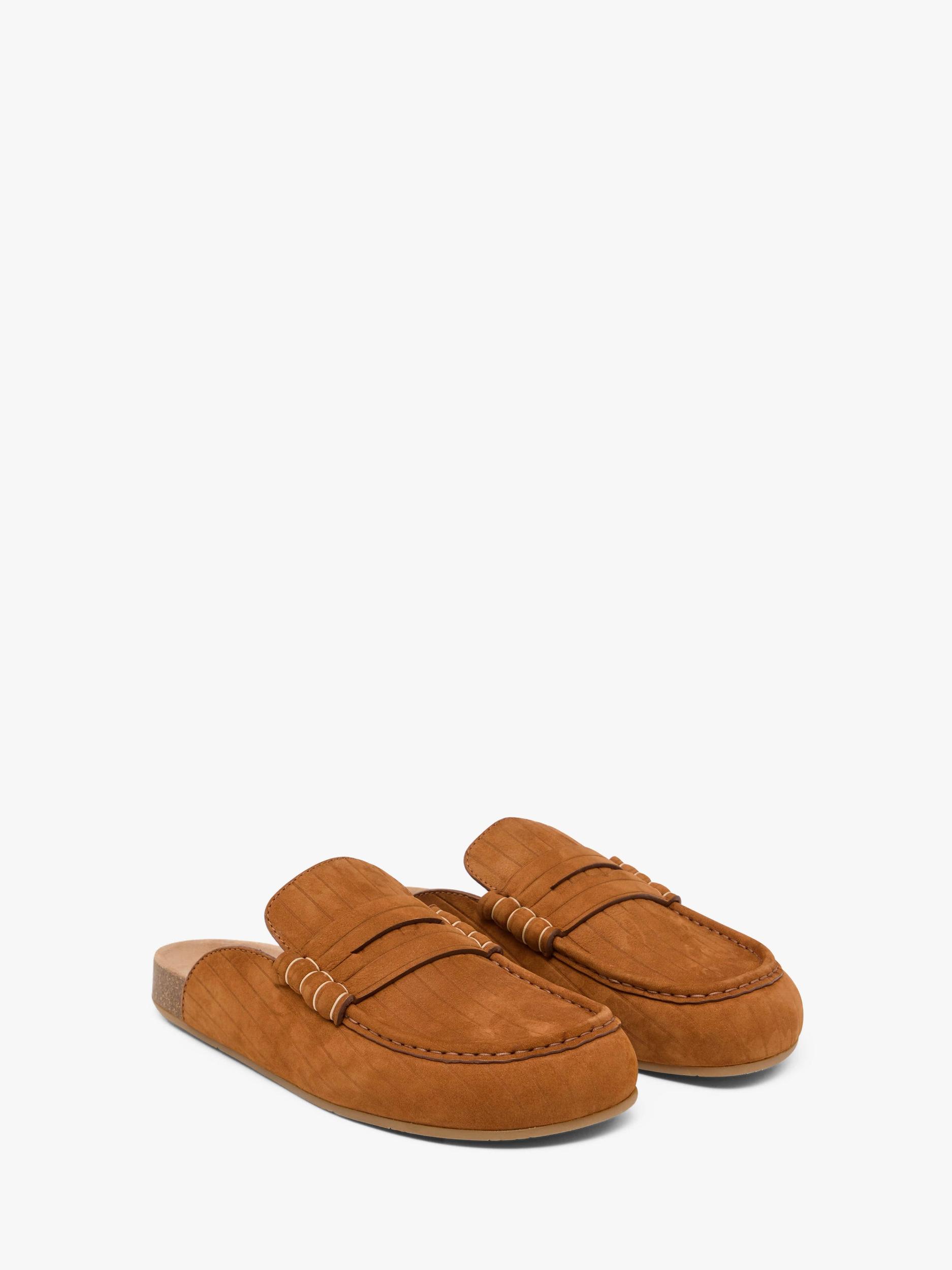 Loafer mules complete in a textured suede fabrication Calf leather front band and binding Rounded toe Wide fit style, if in-between sizes, take one size smaller than normal
