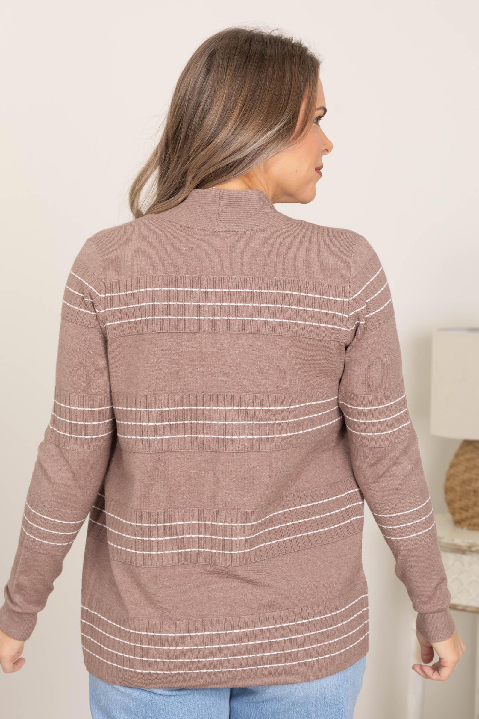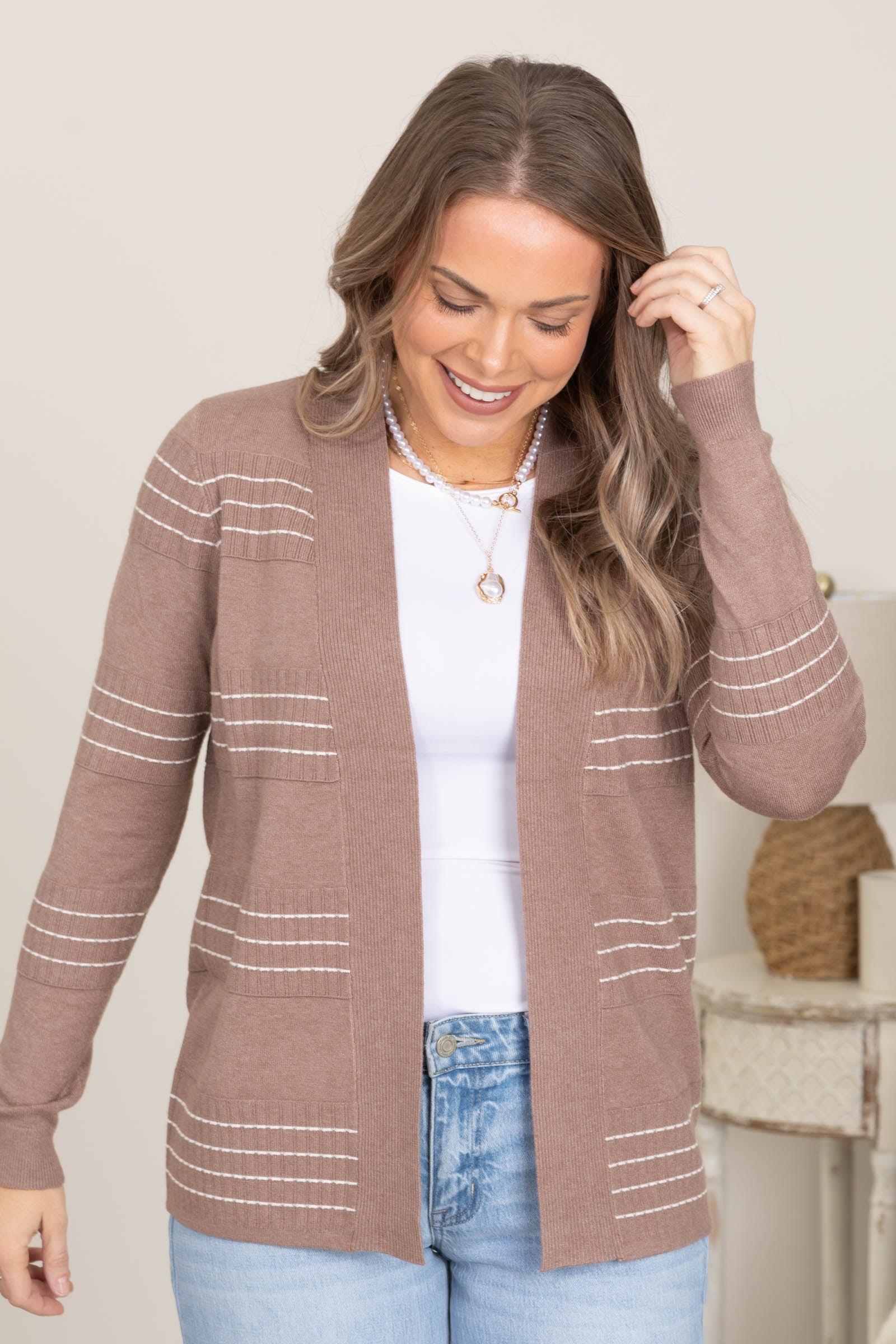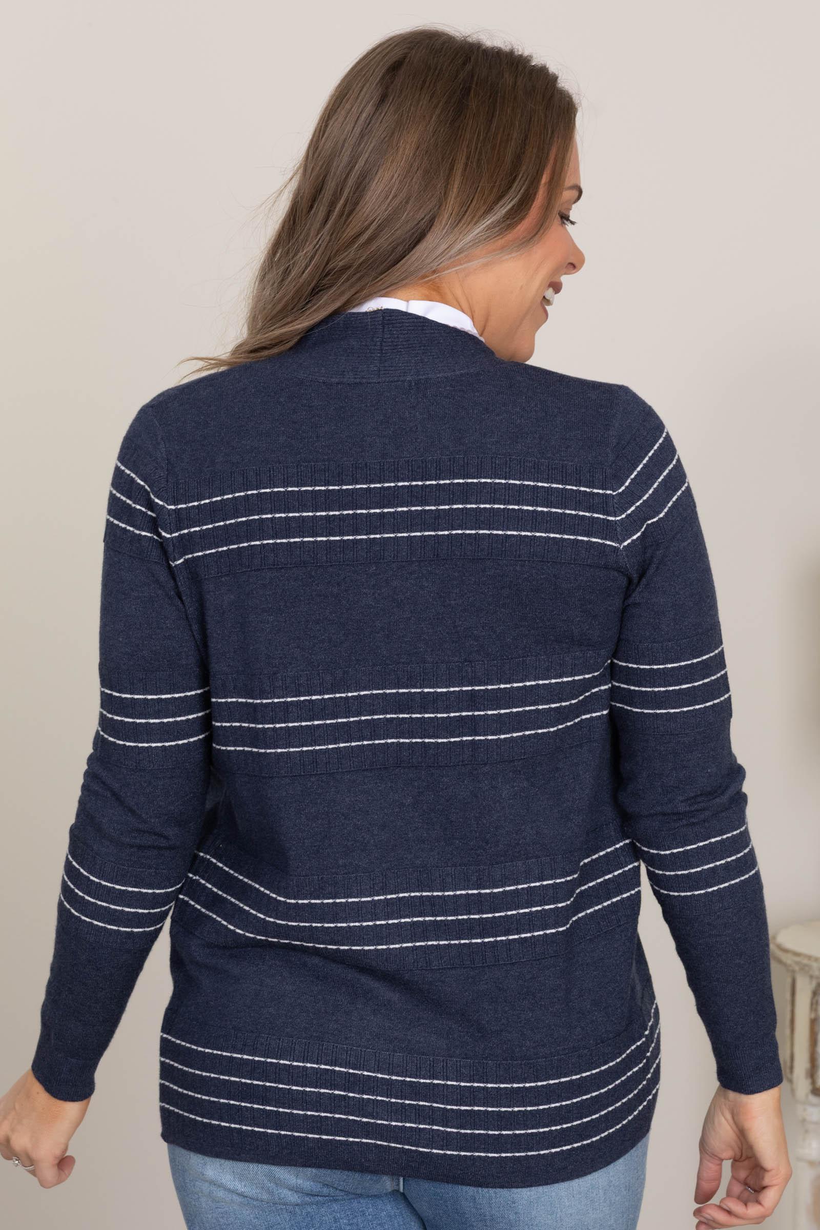 Product Details Colors: Navy, White Print: Stripe Neckline: Open Front Sleeve: Long Sleeve Hemline: Straight Brand: Staccato Material and Care 55% Viscose 45% Nylon Hand Wash Cold Hang/Line Dry Size and Fit Small: Bust 38" Waist 38" Length 25.5" Medium: Bust 40" Waist 40" Length 26" Large: Bust 42" Waist 42" Length 26.5" X Large: Bust 44" Waist 44" Length 27" Erica is 5’7” and wearing her true size small