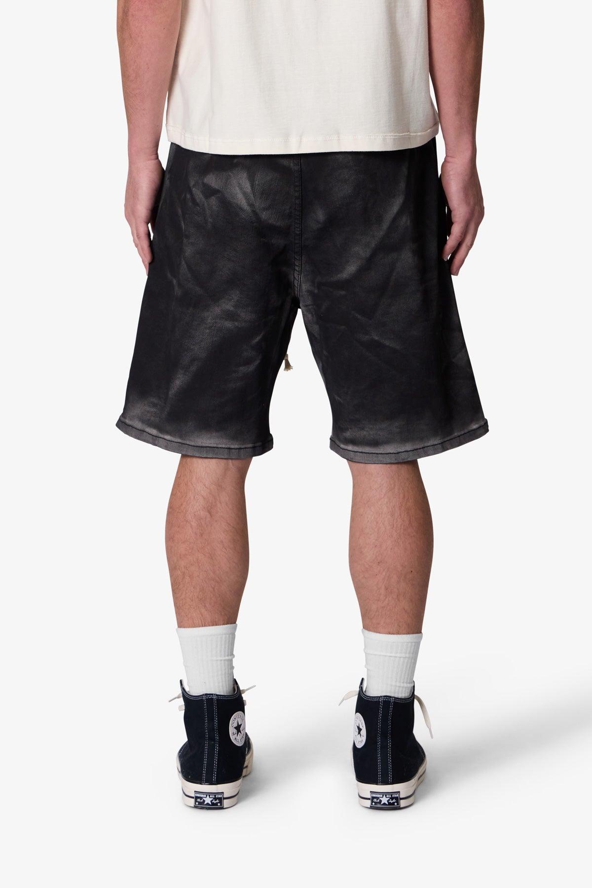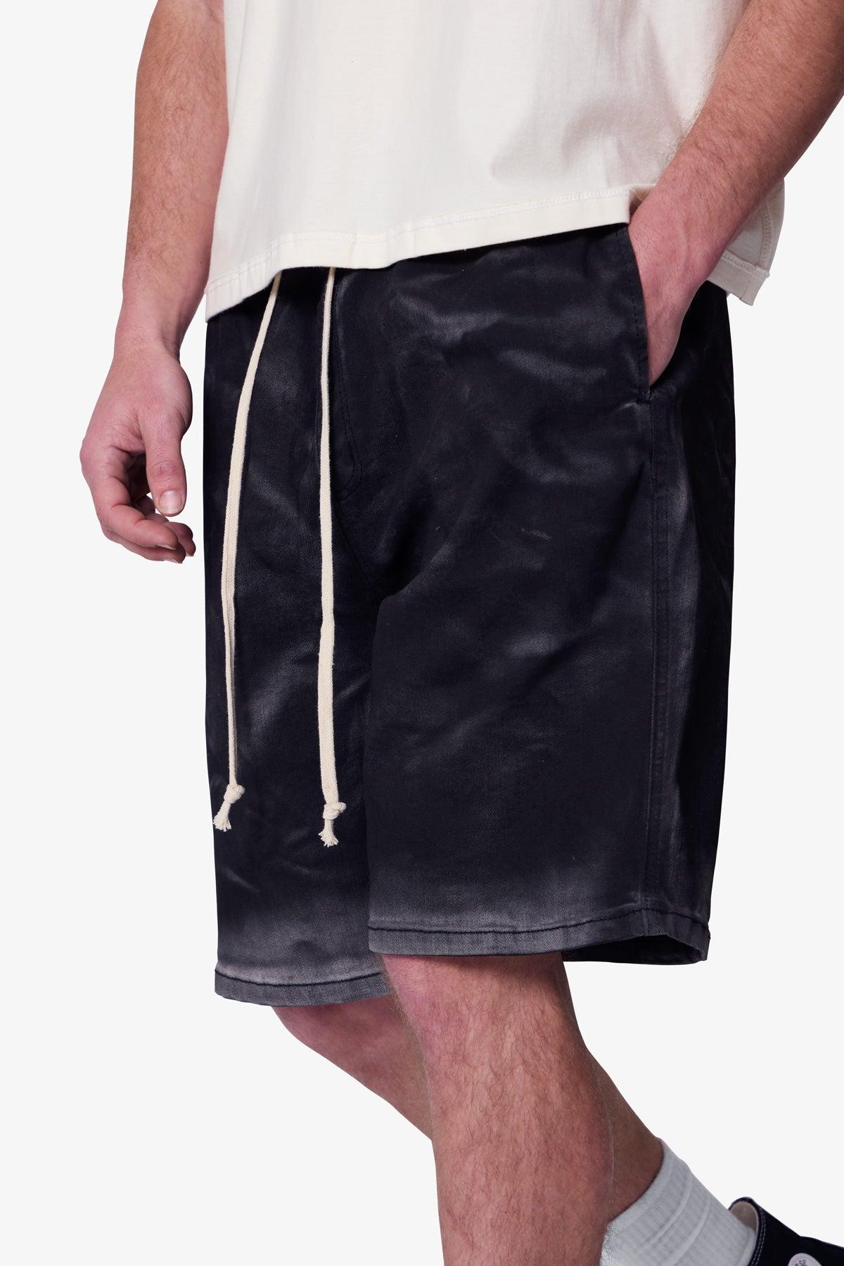 the Stone Charred Shorts are constructed with a custom-woven cotton blend fabric in a relaxed fit. The short feature an elasticized waist in self fabric, welt pockets at the outseam, an external cotton drawstring, and finished with a wax coating. details relaxed fit 68% cotton 20% polyester 11% viscose 1% spandex model