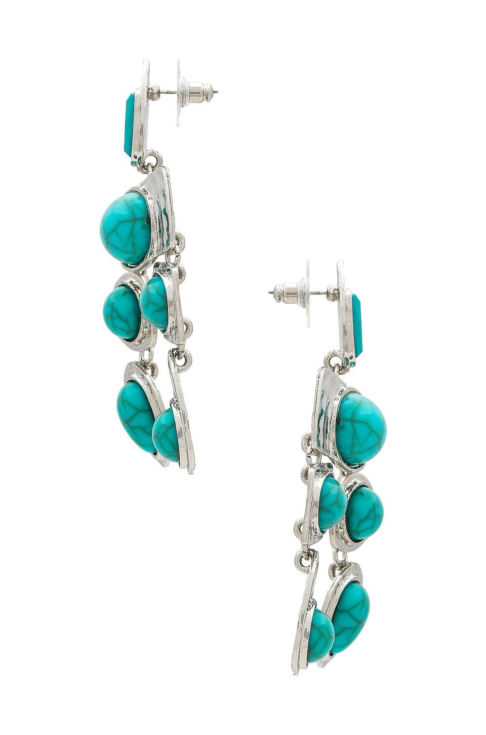 Silver-tone stamped metal with turquoise like stones. Made in China. Post-back closure. Measures approx 1.25" W x 2.75" H. Revolve Style No. PETM-WL438. Manufacturer Style No. MS8871.