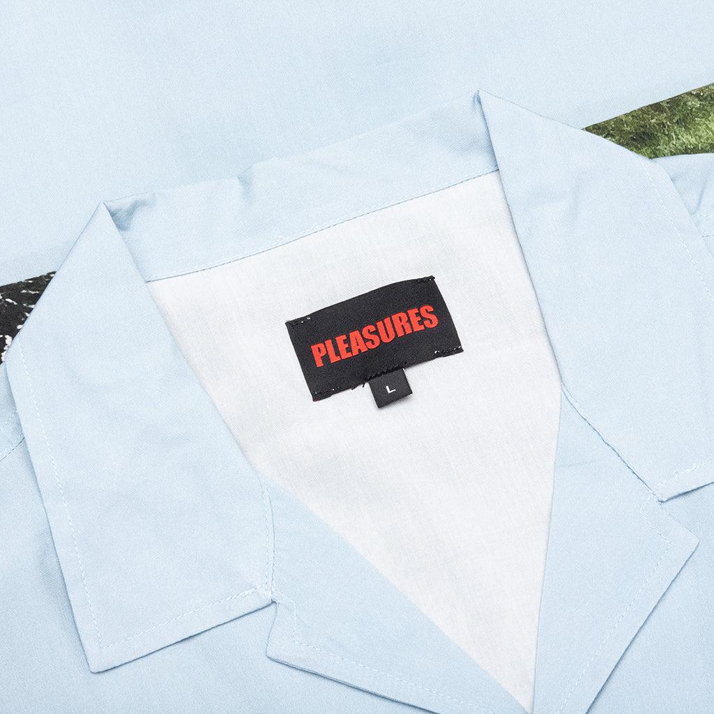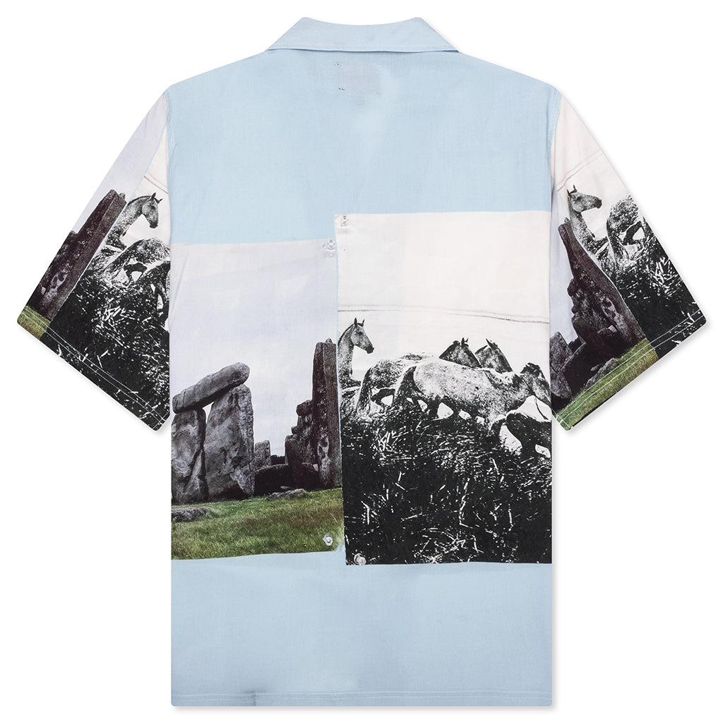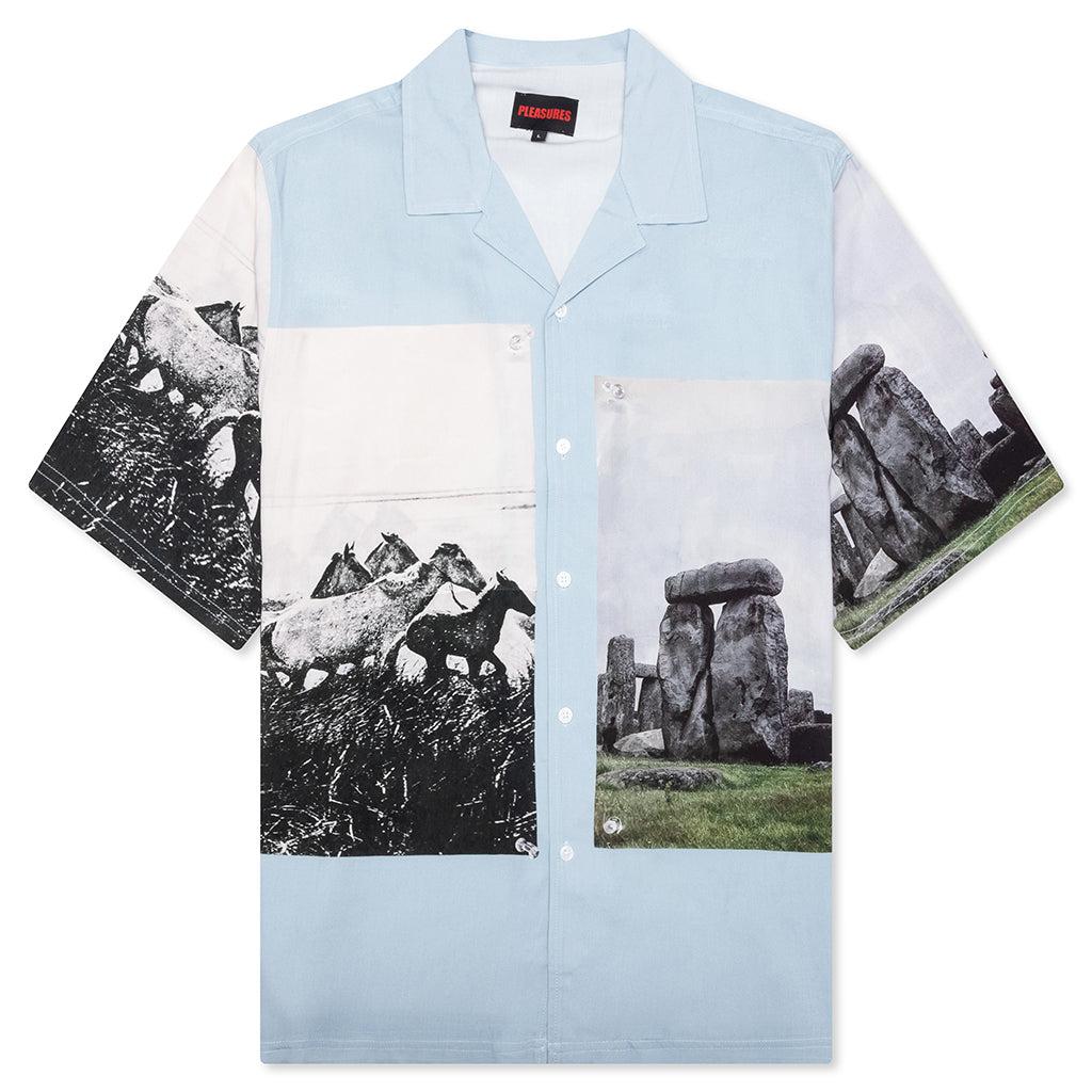 The Stone Horse Button Down from Pleasures is composed of 100% printed rayon challis and features an all-over horse print with an additional sublimation print. This style has a camp collar with a full button closure down the front, rounding out the look. 100% Printed Rayon Challis Camp collar Button closure All-over print Short sleeve Straight hem Style No: P25SP022-BLUE P25SP022 BLUE