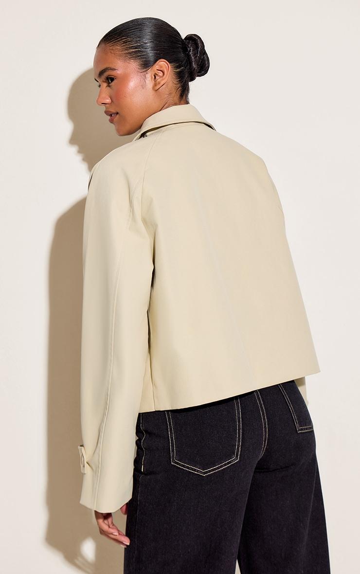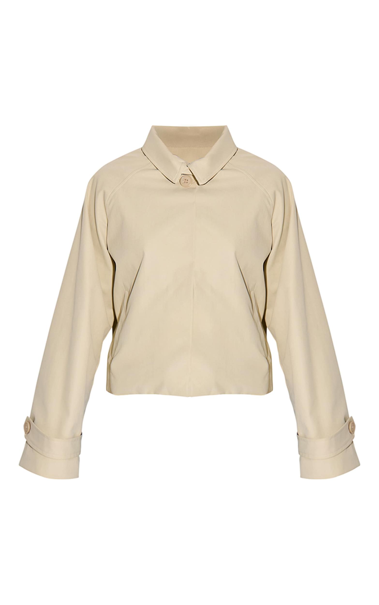 Anchor your everyday style with an outerwear piece that truly understands the power of confident layering. This stone long sleeve trench style jacket redefines classic tailoring with its contemporary cropped length and relaxed silhouette. It features a sharp, standing collar and a neat button-through fastening, while wide raglan sleeves with buttoned cuffs enhance its modern, artful design. Discreet side pockets blend seamlessly into its clean lines, offering a polished finish. Pair it with tailored pants and pointed ankle boots for a sharp city look, or keep it effortless with straight-leg denim and fresh sneakers. It’s the essential layer for an unforced yet polished aesthetic.Length approx 48.5cm/19inch (Based on sample size US 4)Model wears size UK 8/ EU 36/ AUS 8/ US 4Model Height - 5ft 7inchp]:!mb-4inch>Brand: PrettyLittleThingCategory: OuterwearProduct type: JacketColor: StoneMaterial: Faux LeatherNeckline: ShirtSleeves: LongOccasion: Day