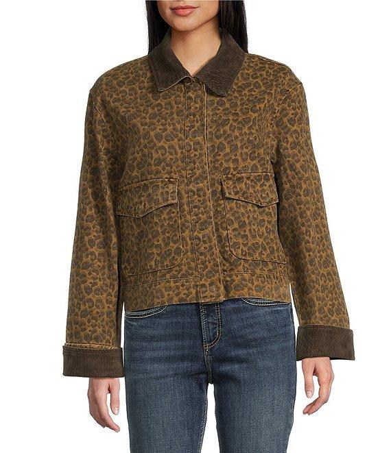 From Stoosh, this jacket features: Allover animal print Peached heavy twill fabrication Corduroy collar Long sleeves Zip front with snap placket 2 flap pockets Cotton Machine wash/tumble dry low Imported.