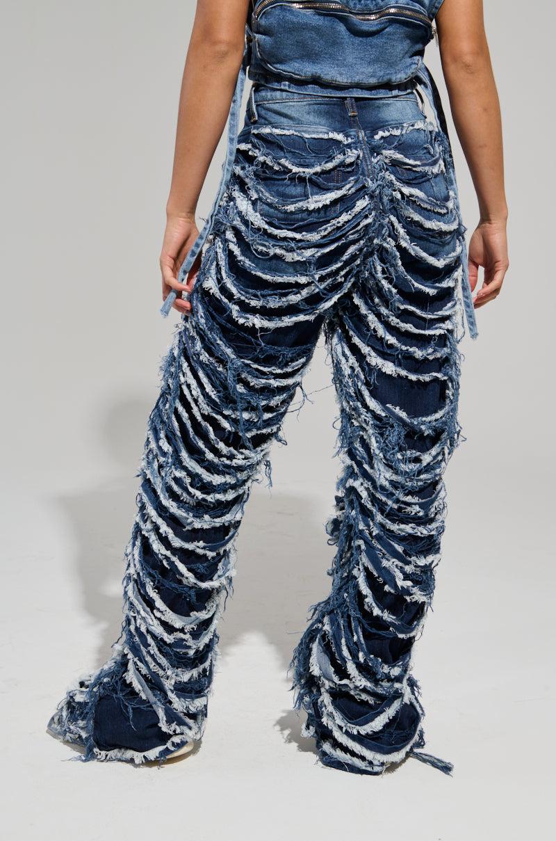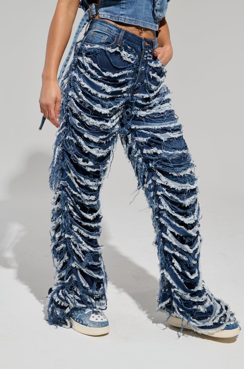 You’re turnin’ heads in The Stop And Stare Distressed Denim Pant. This grungy bottom is crafted from a semi-stretchy cotton dark wash denim base and features a high rise design, functional belt loops, a classic five-pocket style, and ultra distressed ripped detailing throughout its entirety. Complete with a button zip front closure, and a straight leg silhouette. Pair with a cropped tee and sneakers for a finished look. - Self: 98% Cotton 2% Spandex, Contrast: 100% Rayon- Some Stretch- Imported (all measurements approximate from size 3)- 11” Rise- 33” Inseam- Model is 5’7” and is wearing size 3 Product ID: 432035