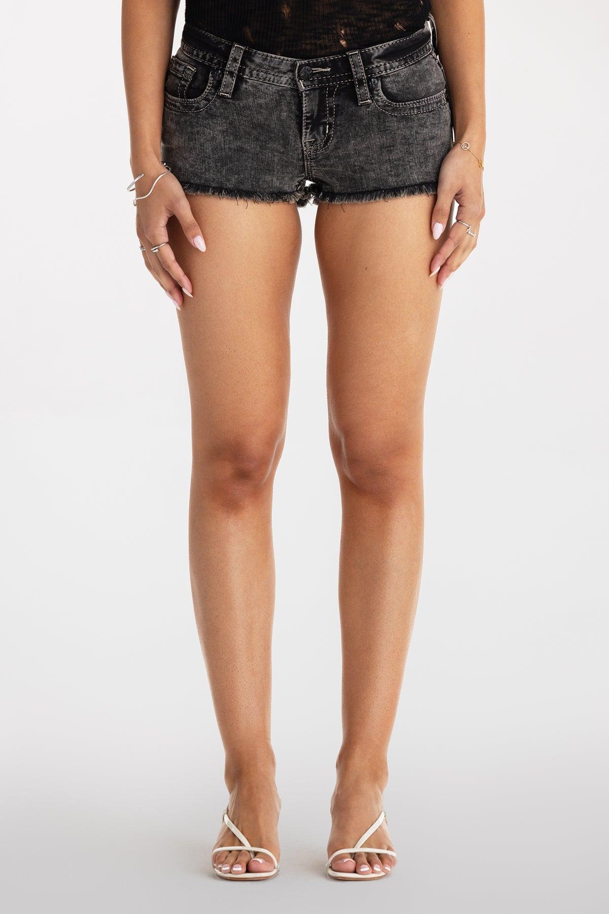 Washed, low-rise shorts- Raised denim chevron "M" with stitched edge detailing- Black rhinestone rivet accents- Frayed hems- Embossed black studded leather cross Miss Me brand patch- 5-pocket designModel is wearing size: 25Model Measurements:Height: 5'9"Bust: 34BWaist: 25"Hips: 36"Fabric Content: 70% Cotton, 20% Polyester, 8% Rayon, 2% Elastane Care: Gentle machine wash inside-out with like colors in cold water. Tumble dry low.Style No. Grey Smoke: L3742H18-G29