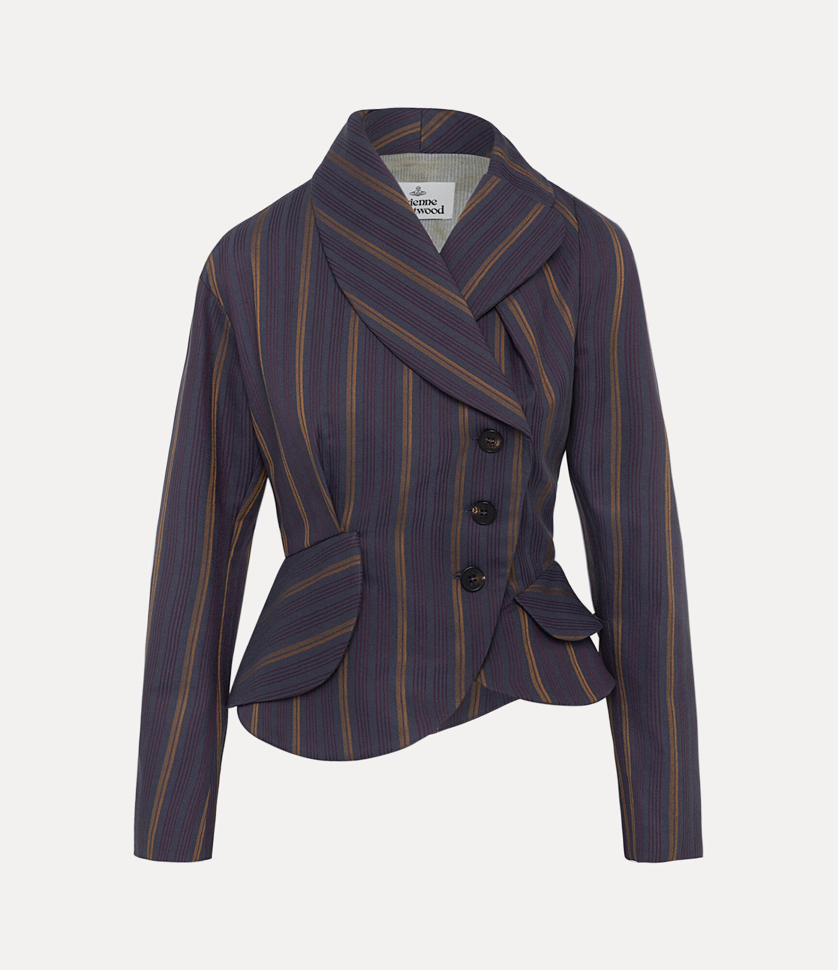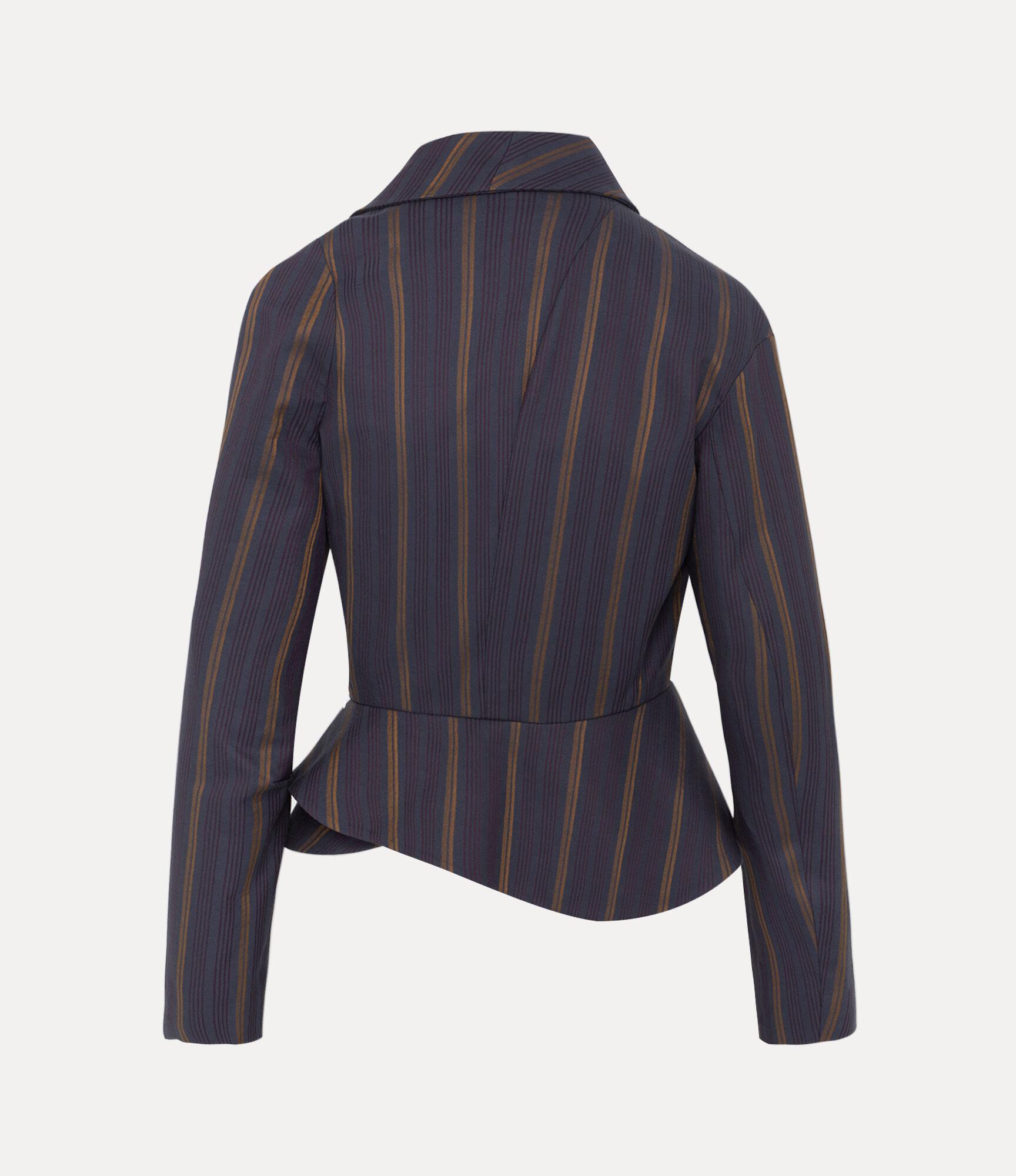 Crafted from a soft cotton blend, our Stormy jacket features a navy base with fine vertical stripes in gold and burgundy, framed by a draped shawl collar. Delicate darting shapes the waist, falling into a sculpted peplum hem, while a playful ‘Coffee Stain’ motif accents the interior.