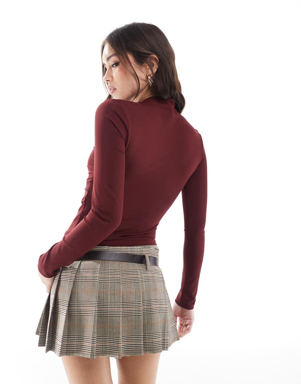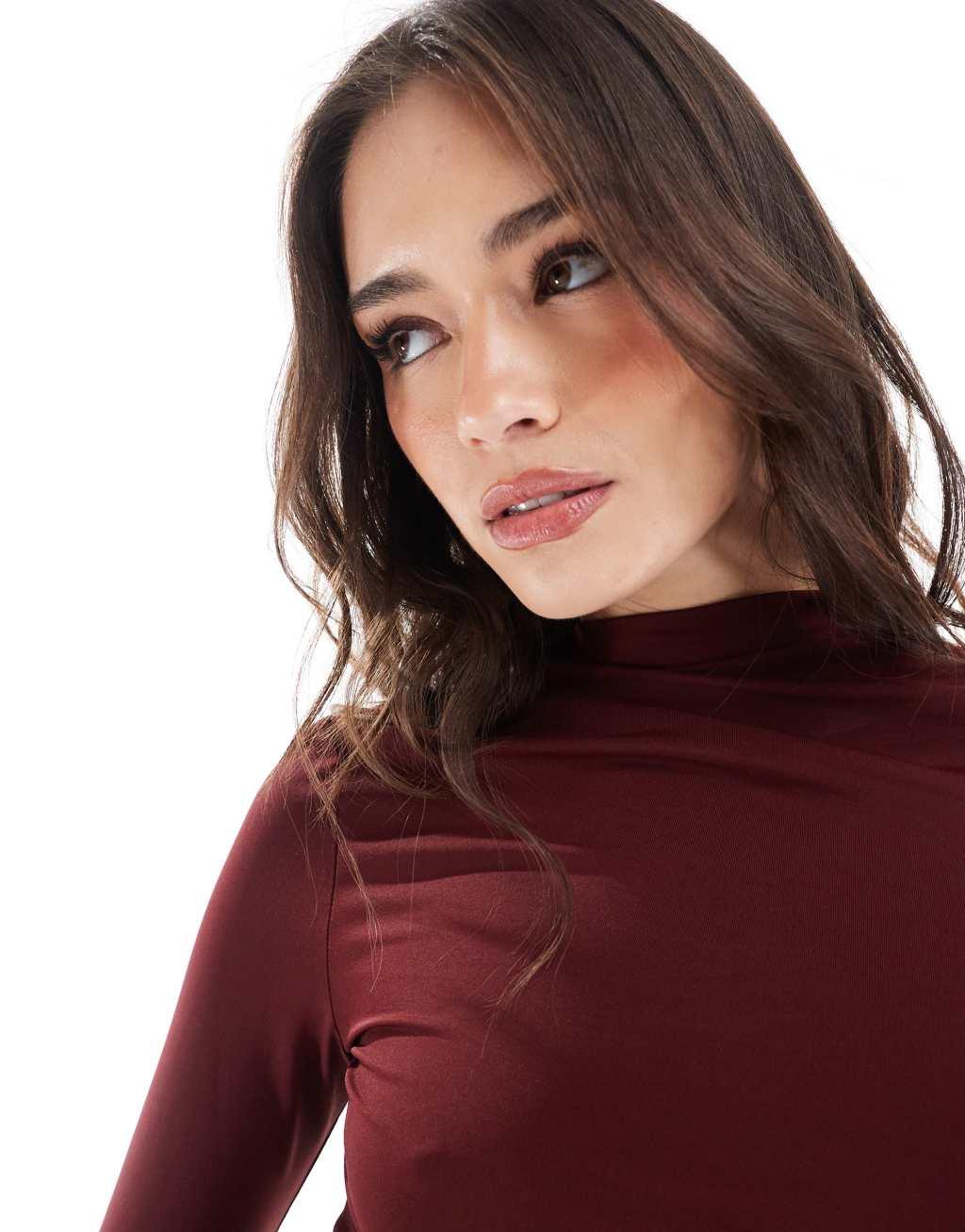 Stradivarius high neck sculpt long sleeve top in burgundy