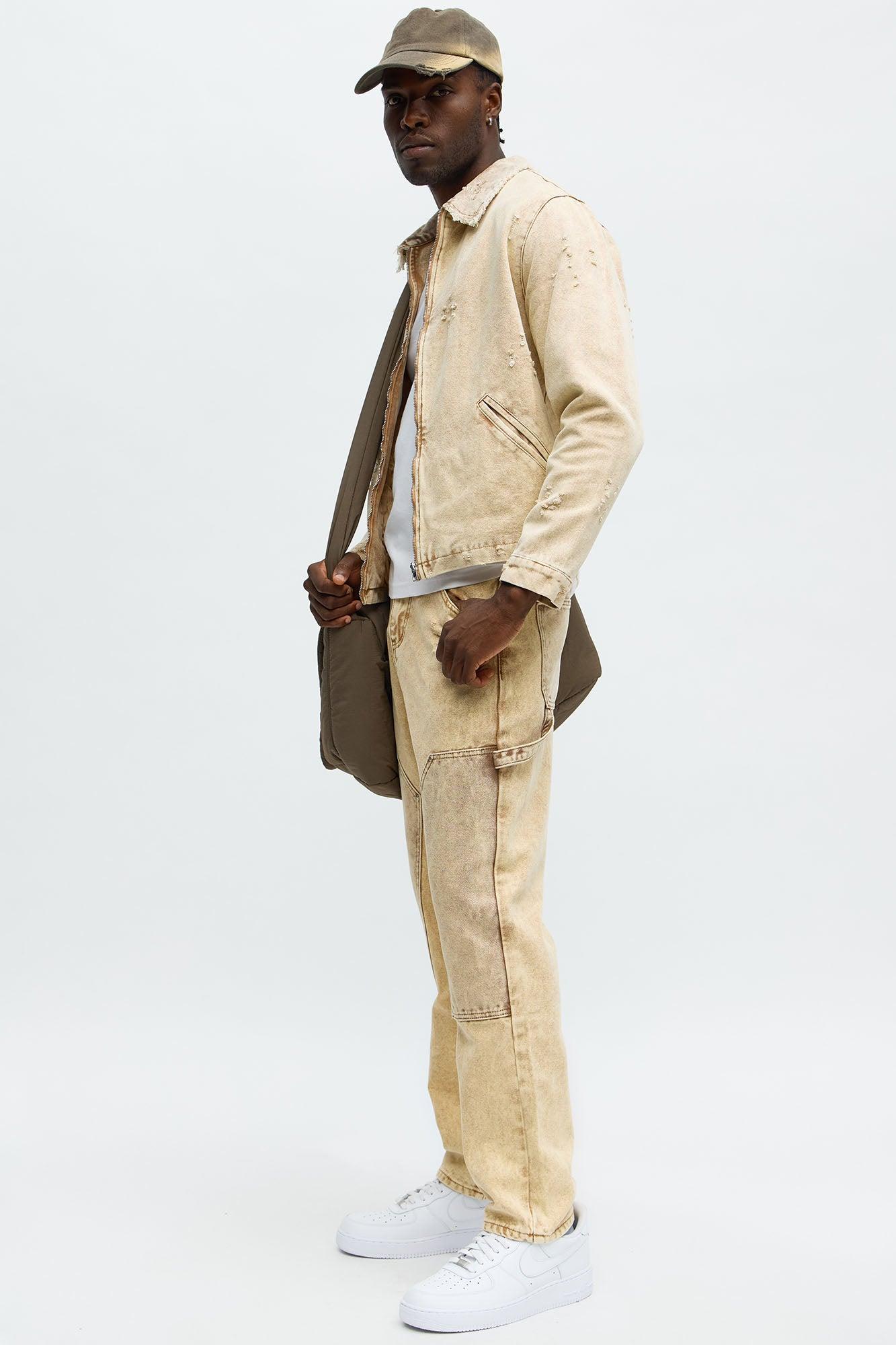 Available In Tan. Straight Fit Zipper Fly Button Closure 5 Pocket Body Carpenter Panel Disclaimer: Due To The Distressing Process, Each Garment Is Unique. Pair With "Relaxed Distressed Frayed Work Jacket" Self: 100% Cotton Contrast: 100% Cotton Imported