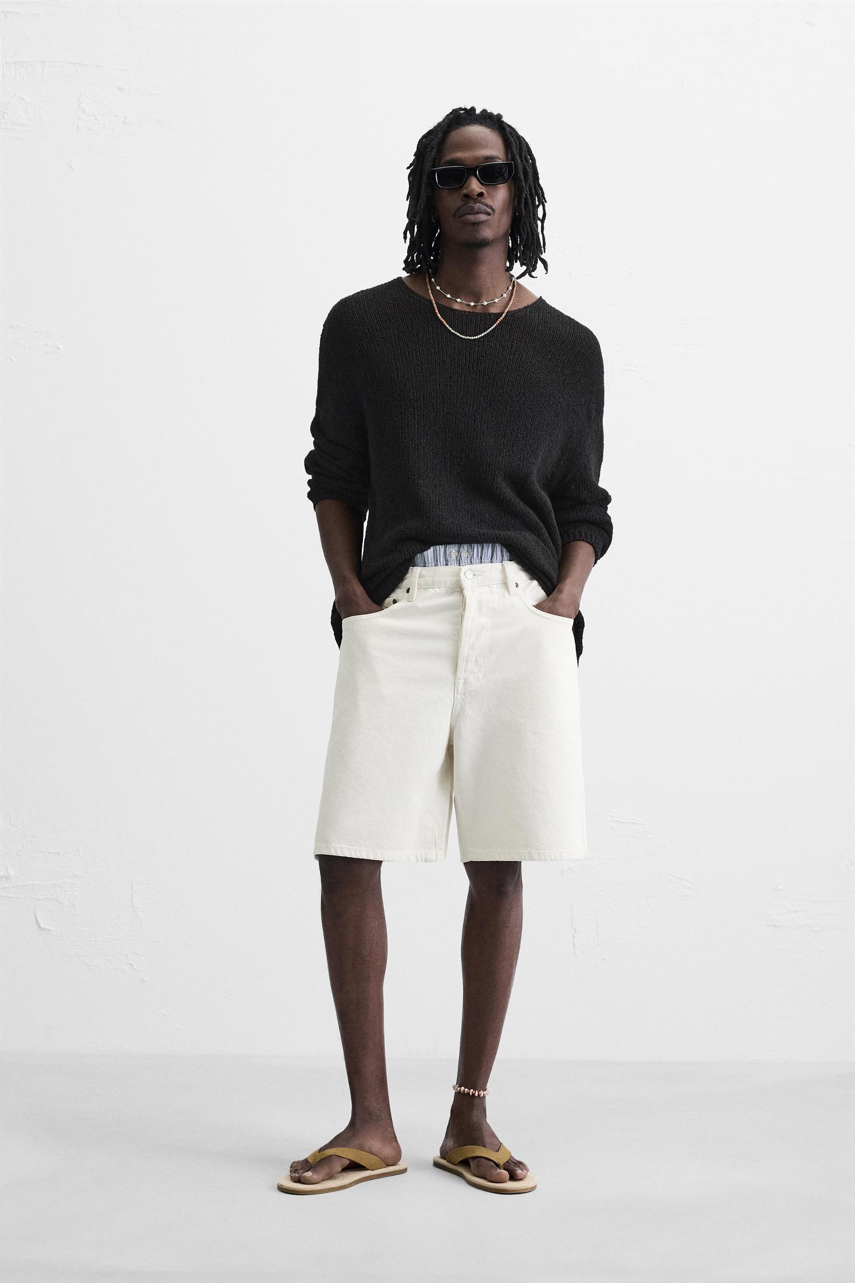 Straight fit denim shorts. Five pockets. Washed effect. Zip fly and button closure.
