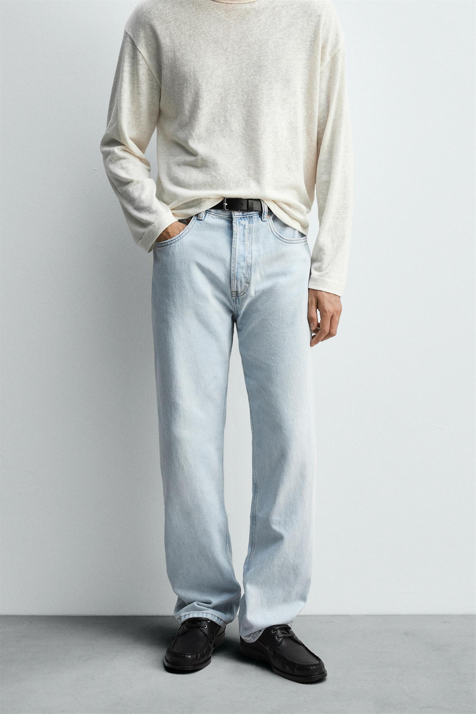 Straight fit jeans. Five pockets. Washed effect. Front button closure.