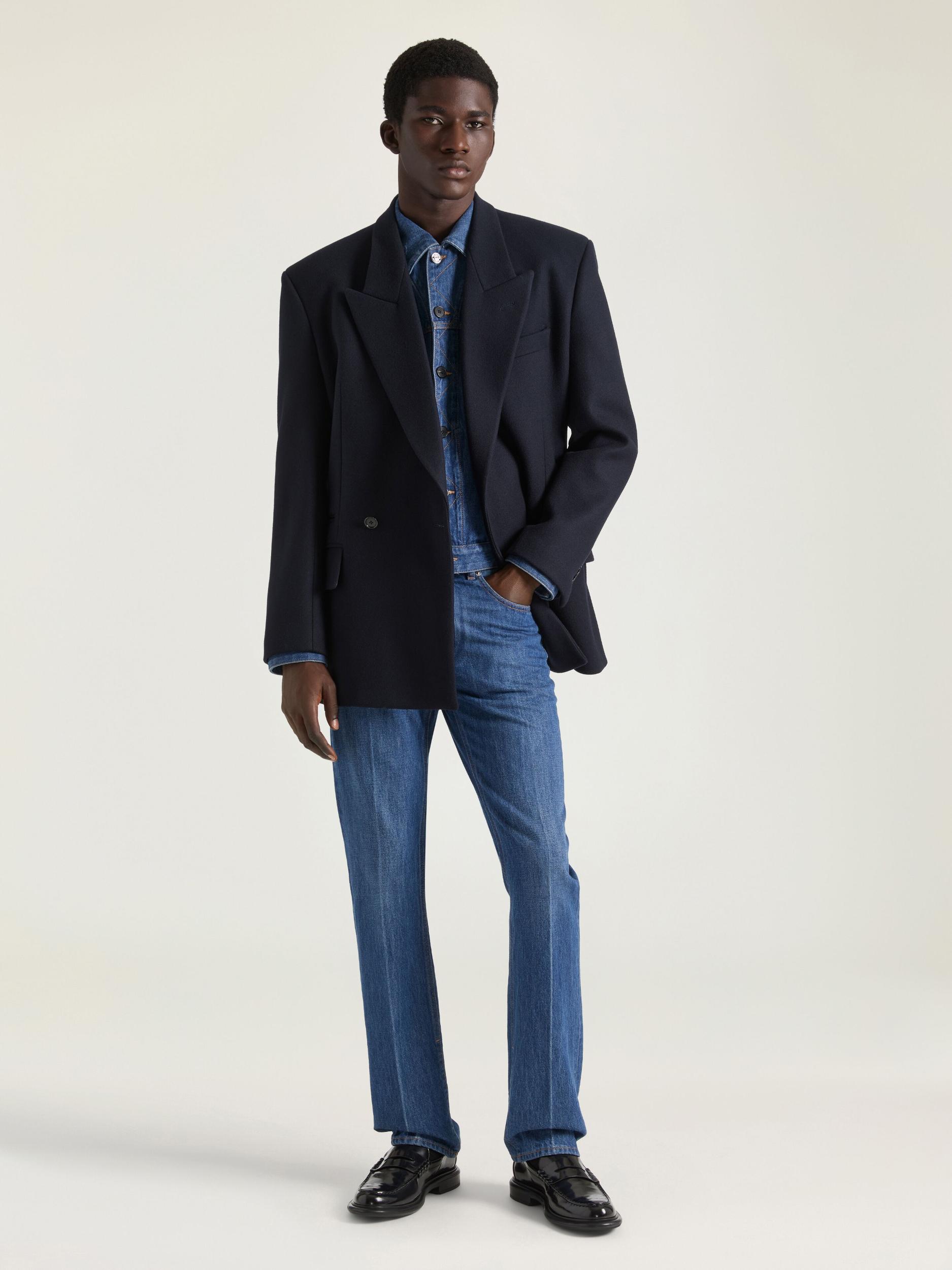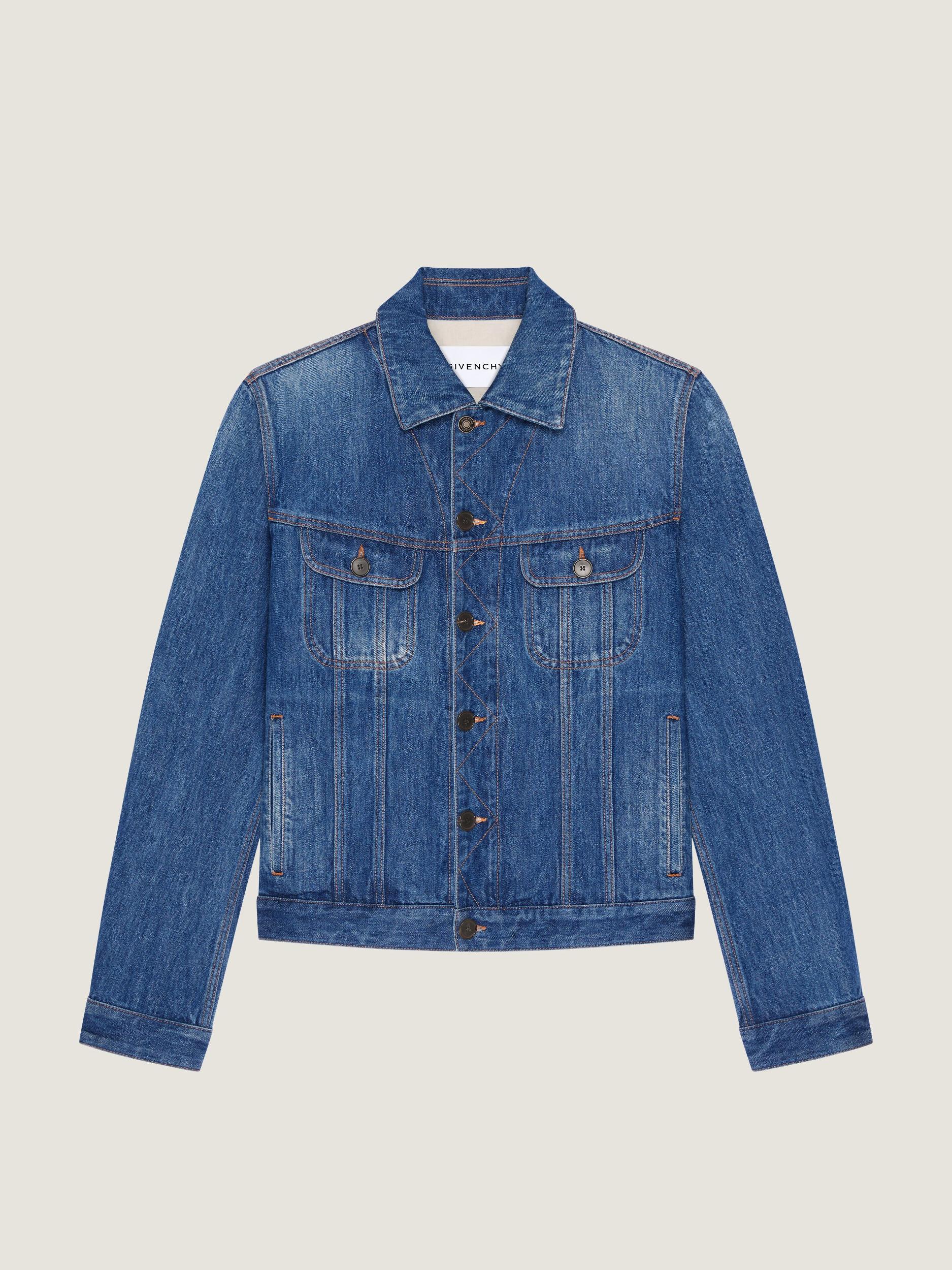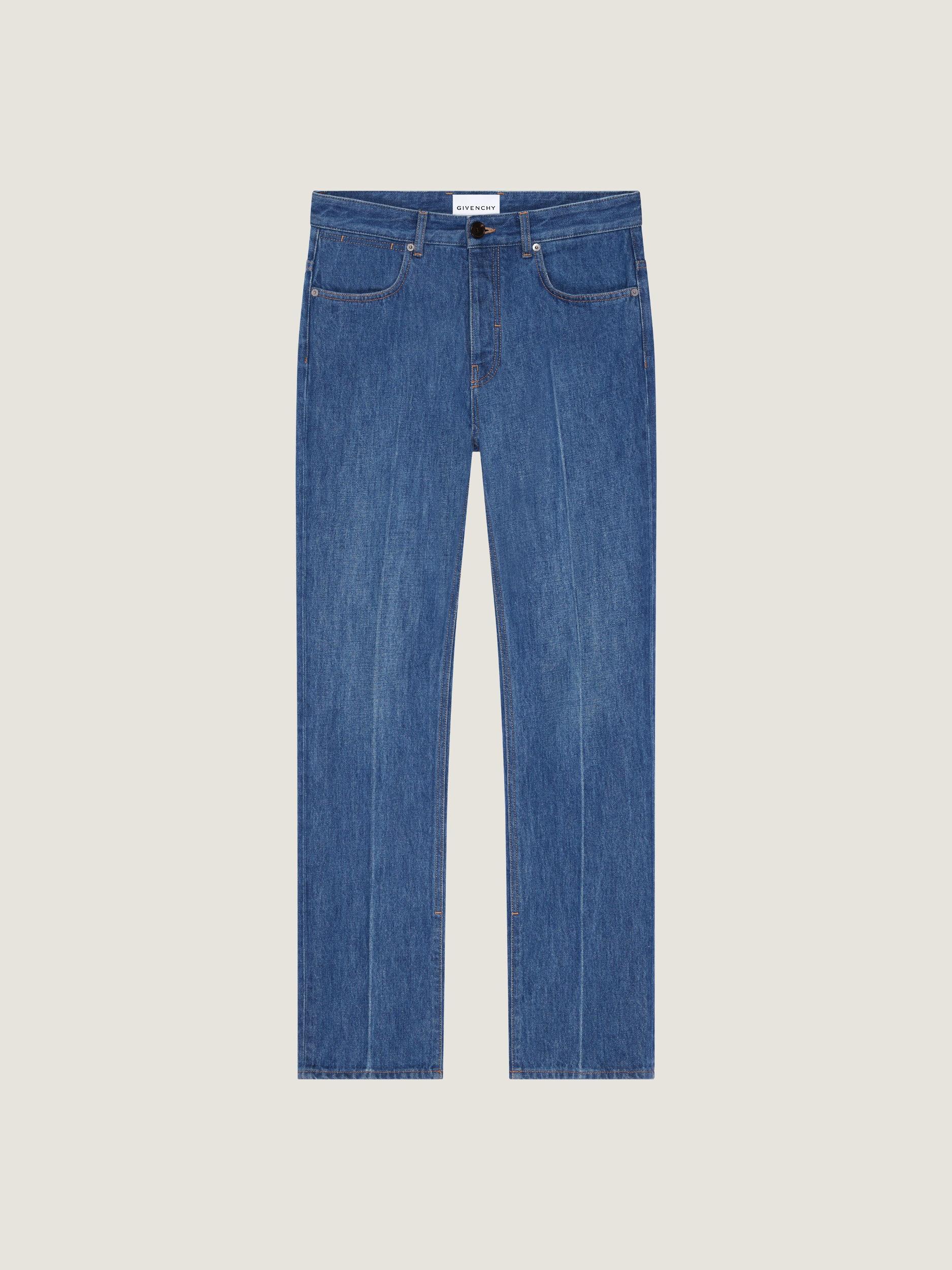 Shadow washed jeans. Waist with loops, zipped and button closure. GIVENCHY engraved button. GIVENCHY leather patch on the back. Crease effect on the legs. Three front pockets. Two back pockets. Straight fit. Model measures 6.1 Feet and wears a size 30.