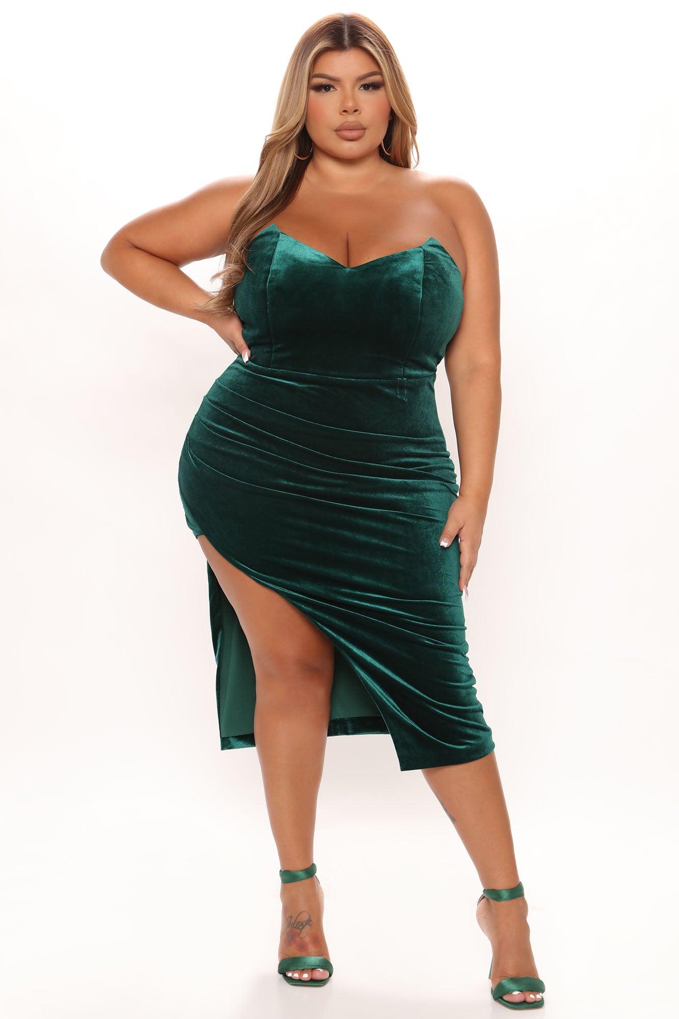 Available In Red And Hunter. Velvet Midi Dress Tube Padded Top High Slit Ruched Hidden Back Zipper Fully Lined Stretch Self: 93% Polyester 7% Spandex Lining: 100% Polyester Imported California Proposition 65WARNING: Cancer and Reproductive Harm - www.P65Warnings.ca.gov.