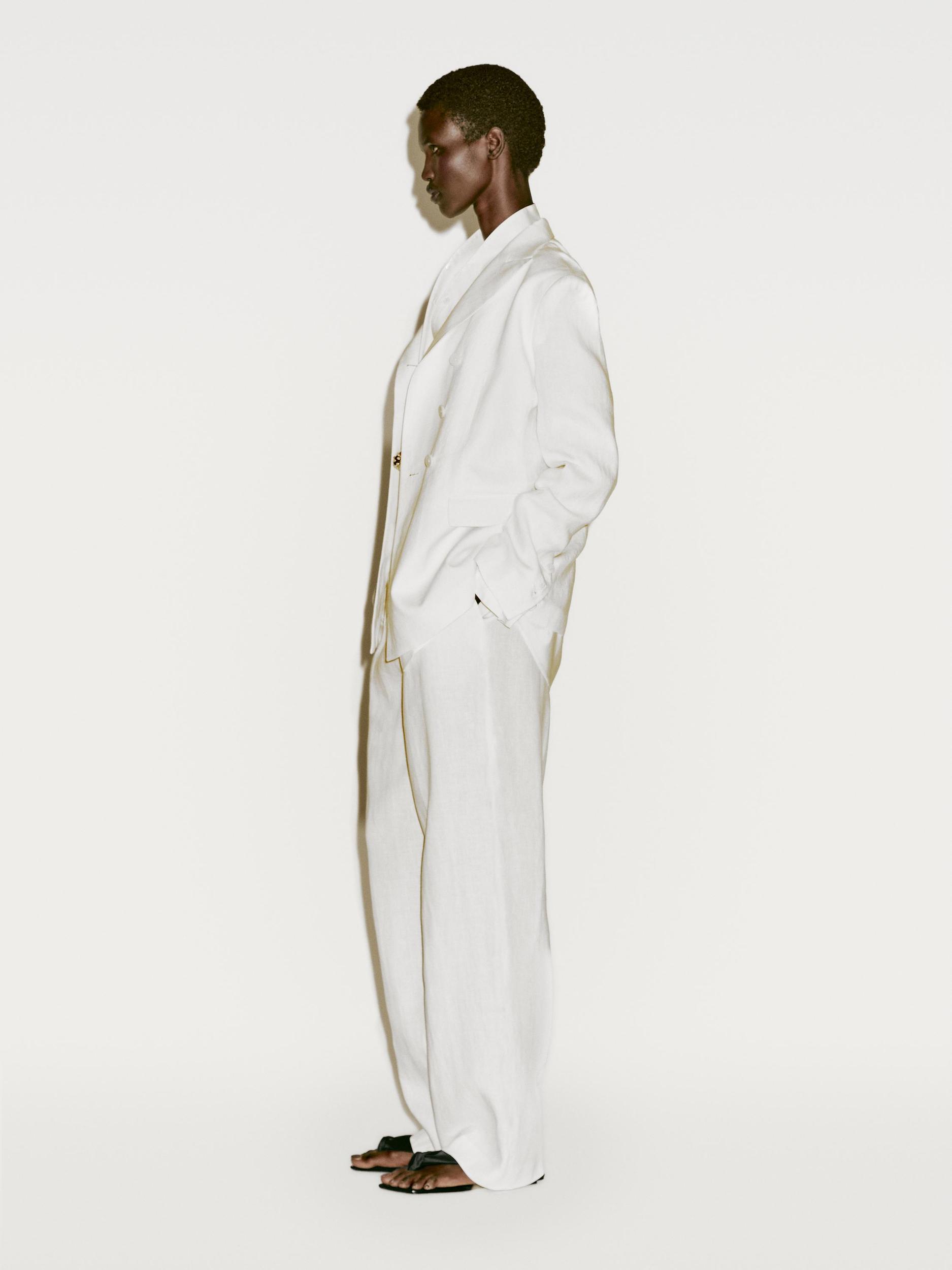 Trousers made of 100% linen., Zip fastening concealed by a placket, with hook-and-eye clasp and button, Two side pockets, One welt pocket at the back, Darted detail on the front, Flowing fabric, Matching garment available