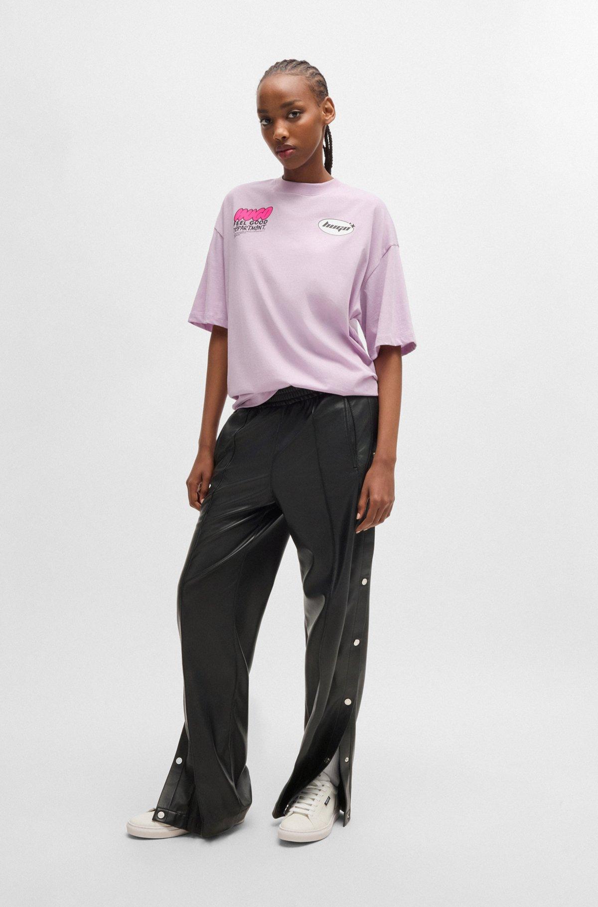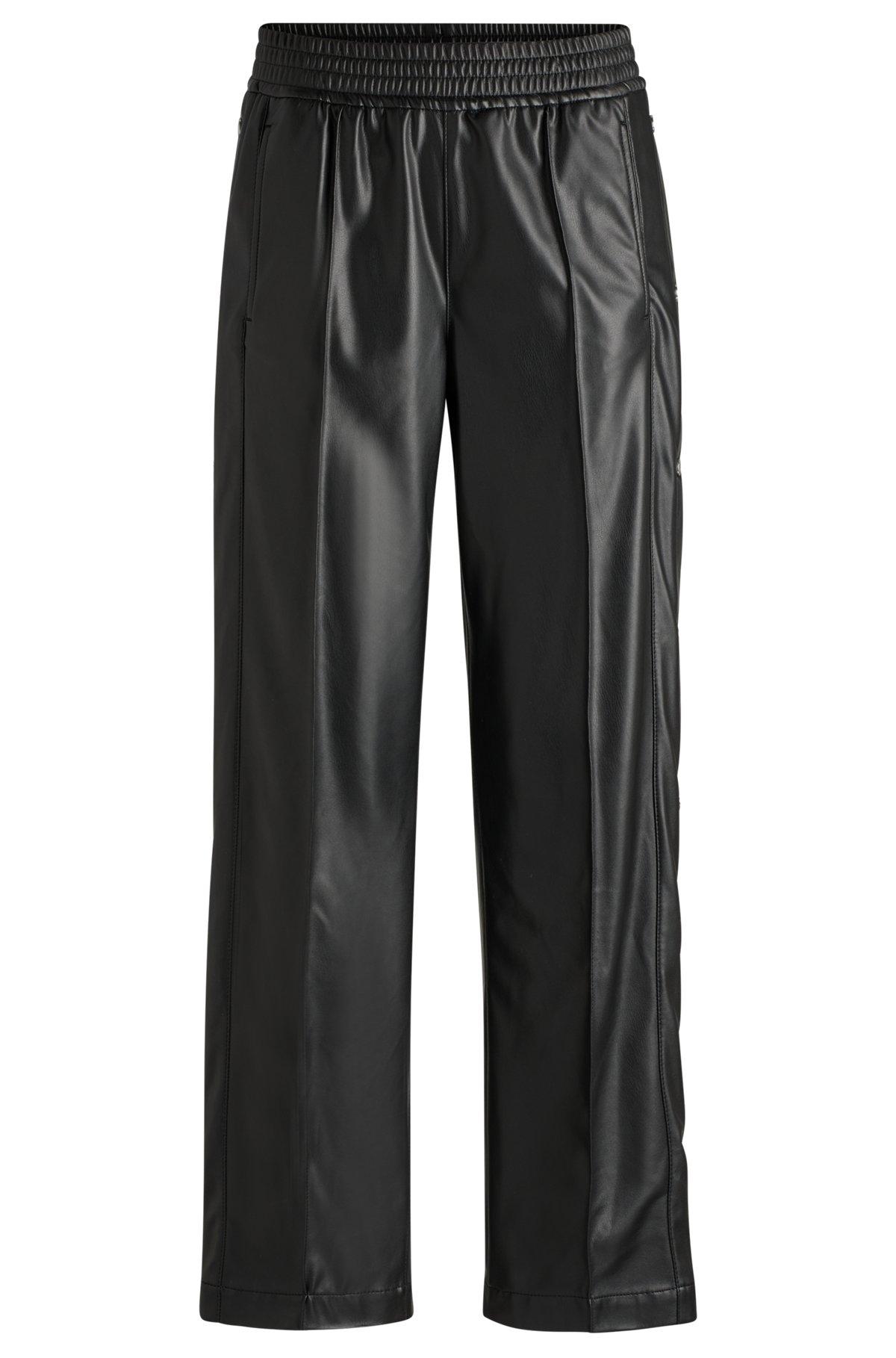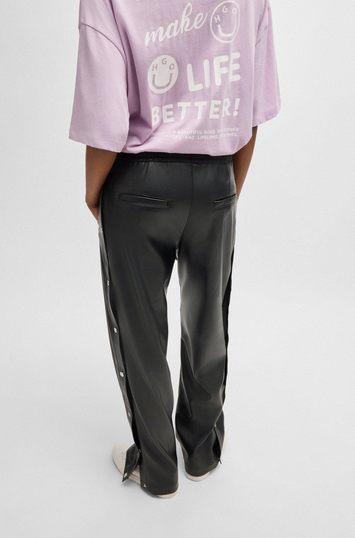 Trend-driven trousers with press-studs on the side seams by HUGO. This pair is cut to a straight fit in synthetic coated fabric. Synthetic coated fabric, sometimes referred to as faux leather, is a fabric designed to resemble real leather, and/or display a matte, glossy, smooth, or textured, coated appearance.