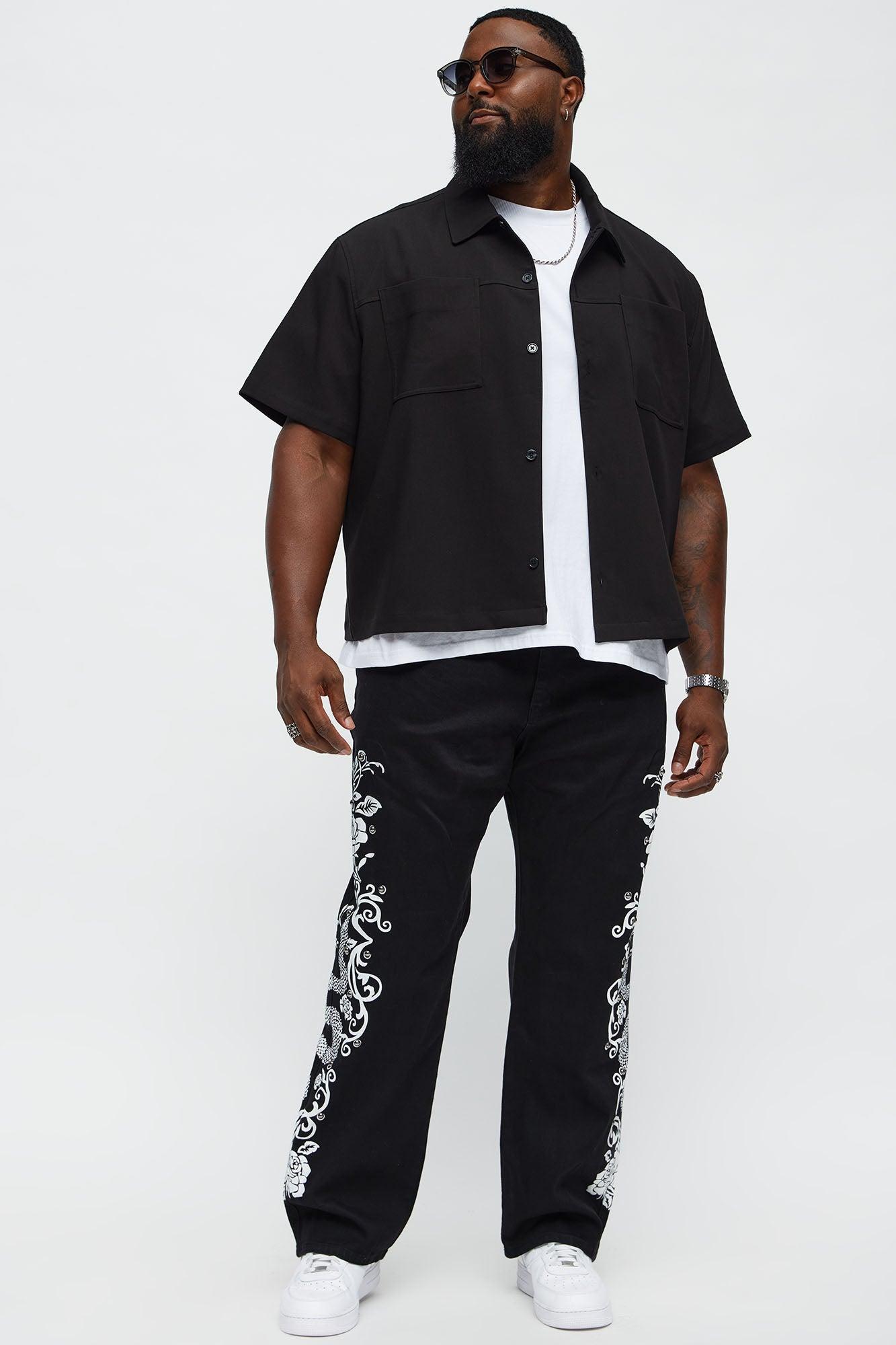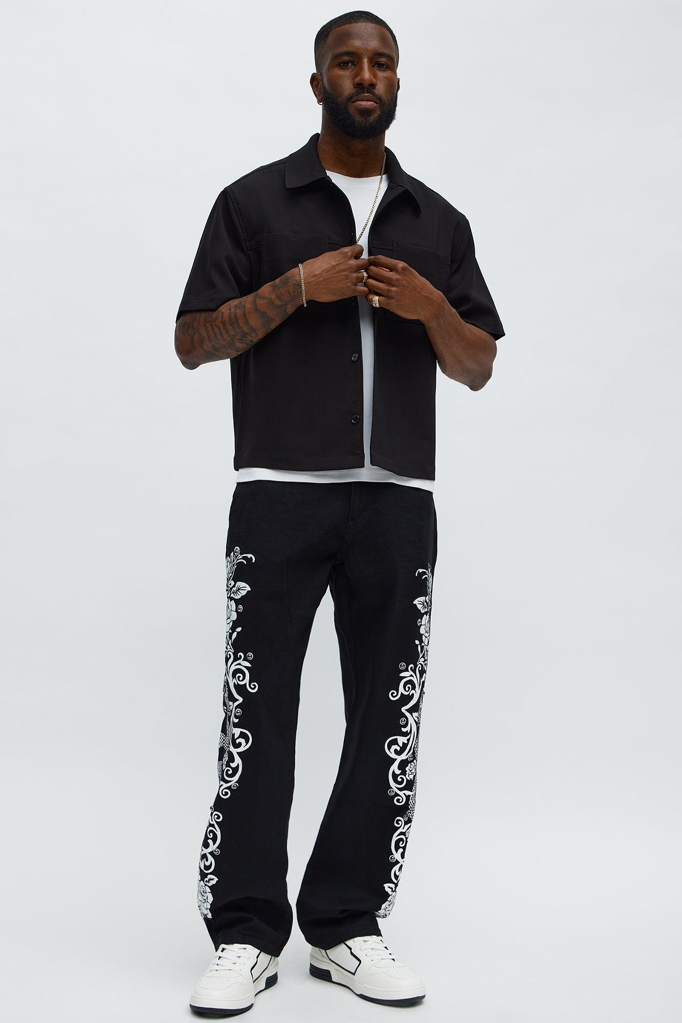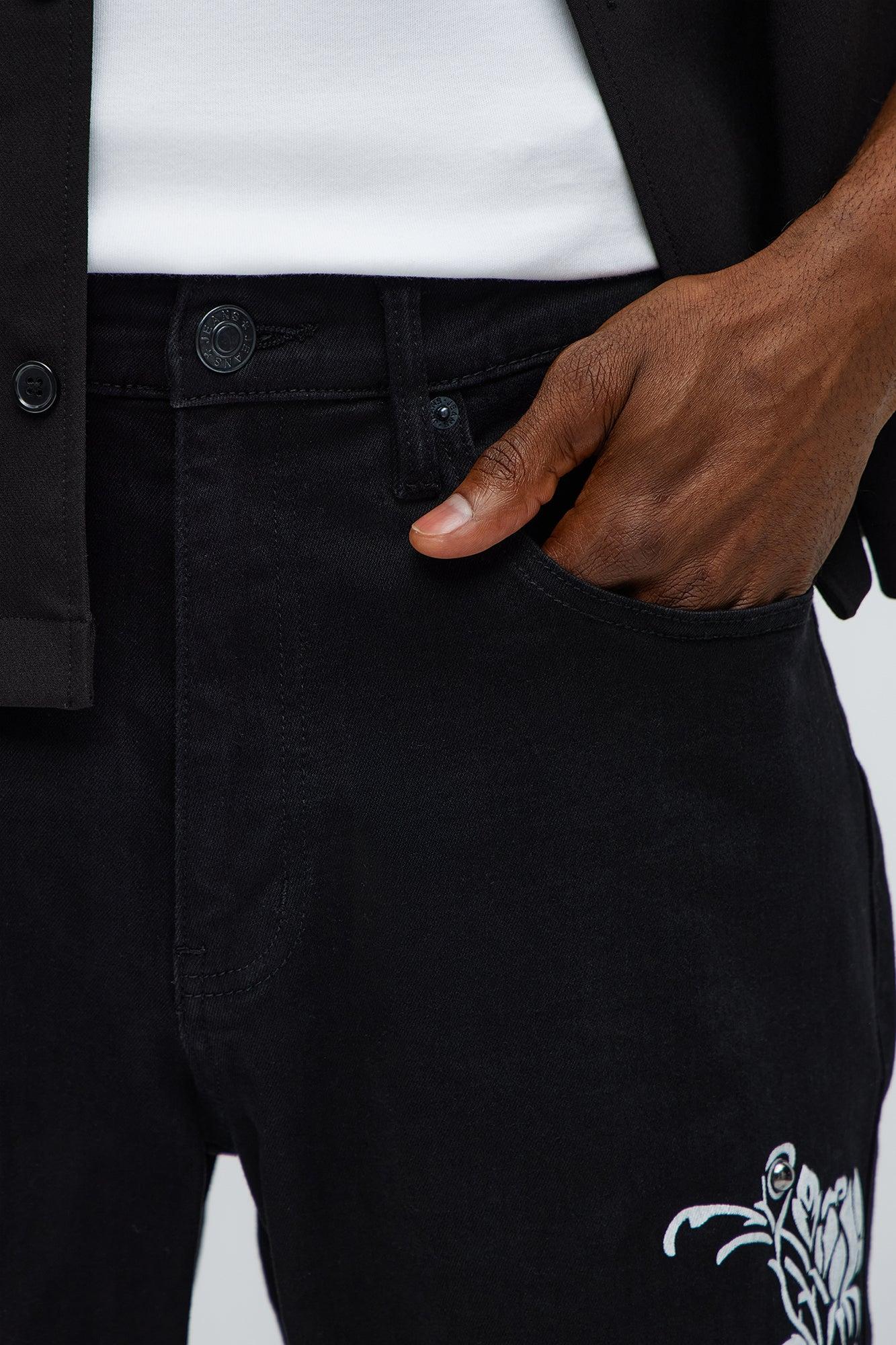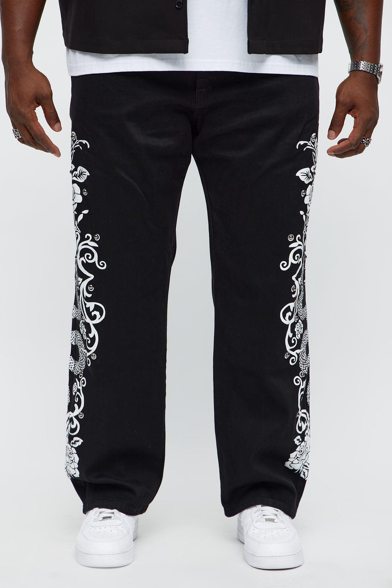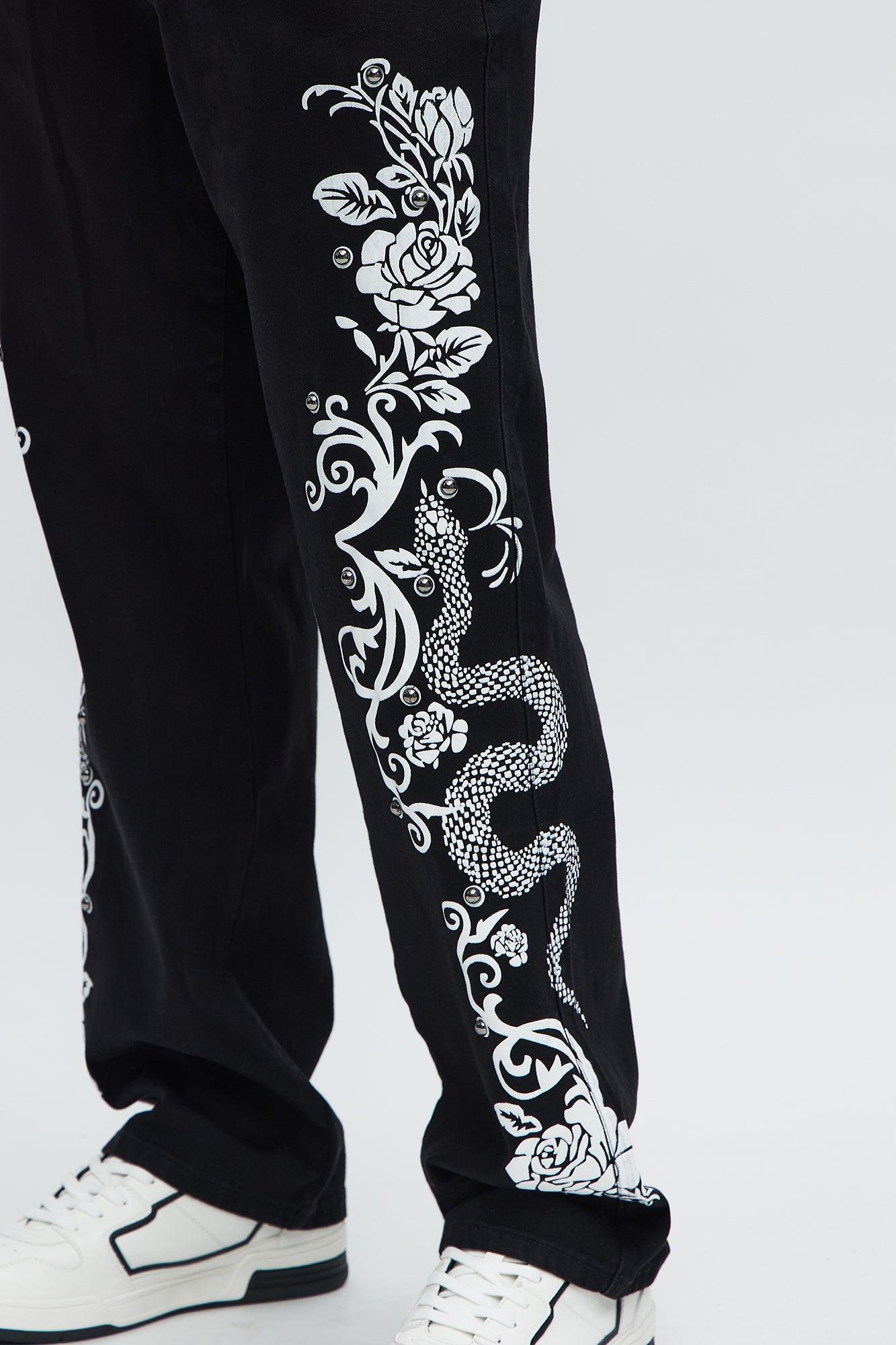 Available In Black. Straight Fit Zip Fly Button Closure 5 Pocket Detail Painted Snake And Rose Detail Studded Detail Disclaimer: Due To The Specialized Wash And Print Process, Each Garment Is Unique. 70% Cotton 28% Polyester 2% Spandex Imported