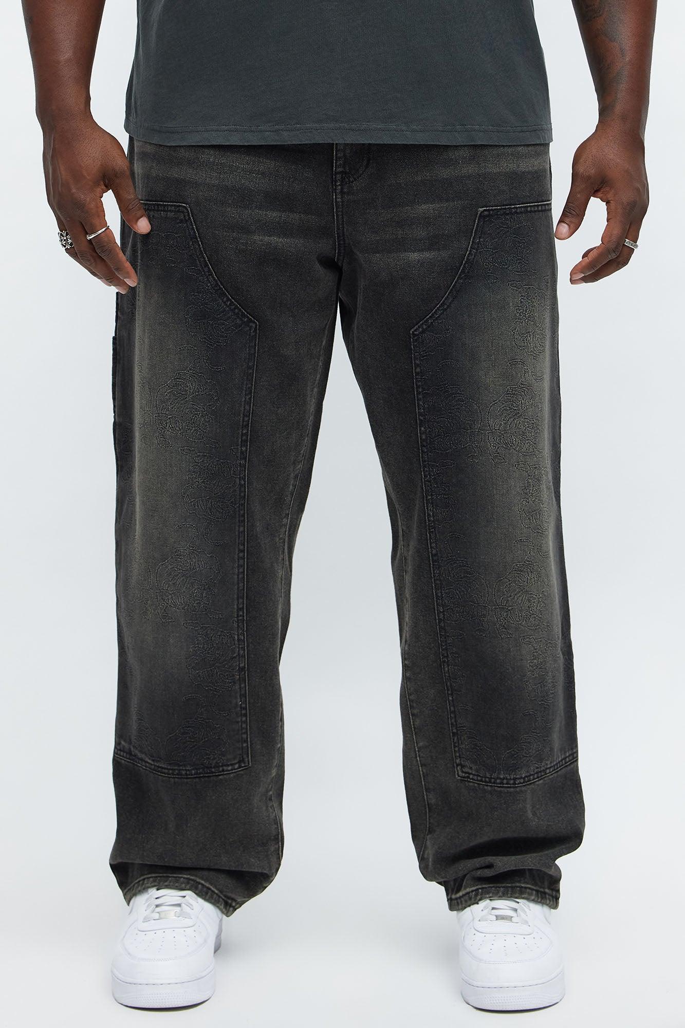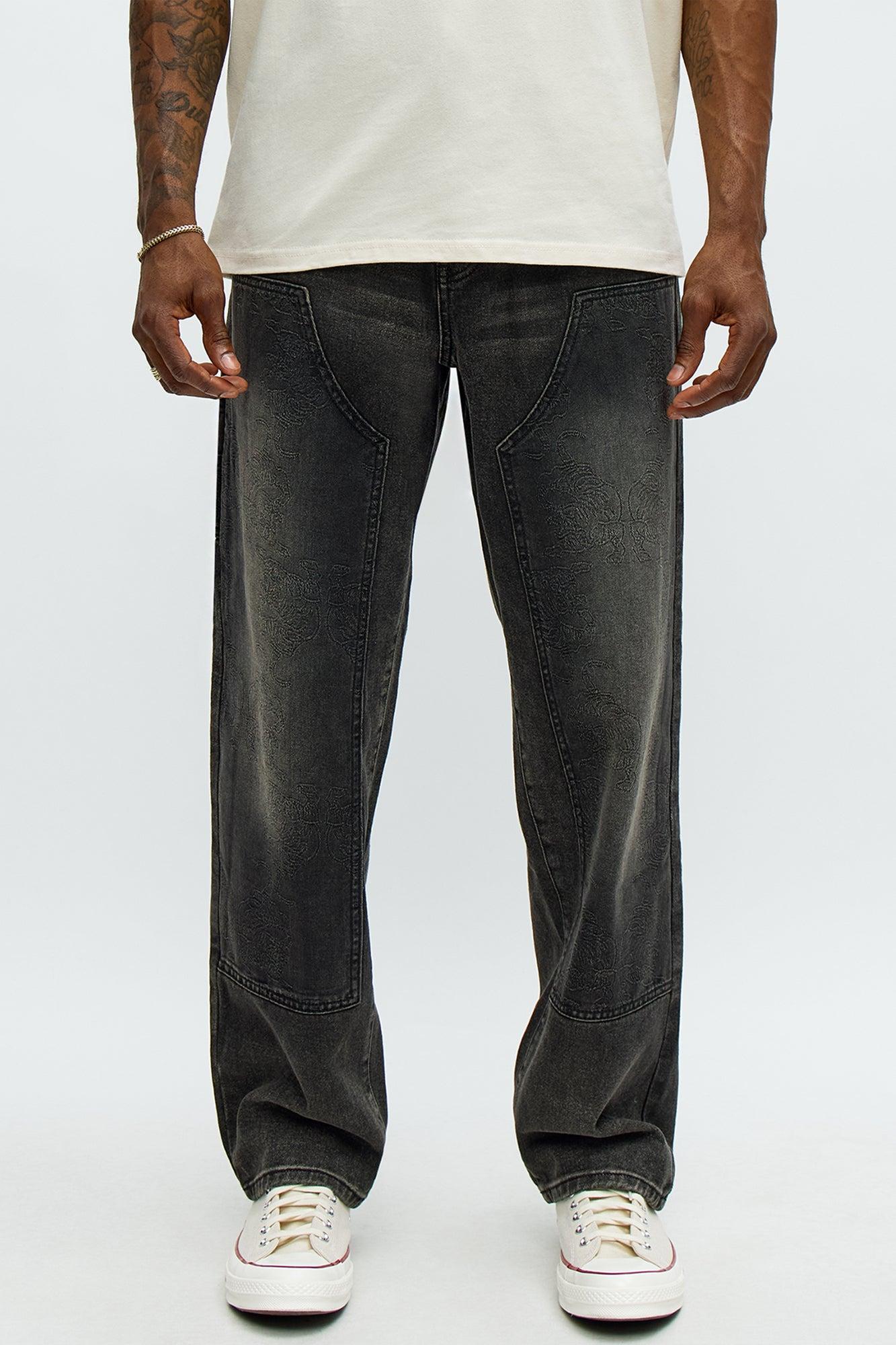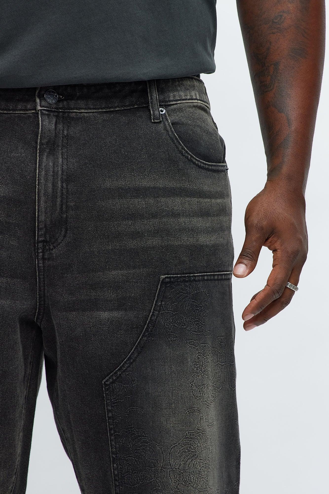 Available In Black Wash. Straight Fit Zip Fly Button Closure Jacquard Tiger Detail Carpenter Detail Self: 100% Cotton Panel Fabric: 65% Cotton 22% Polyester 13% Viscose Imported California Proposition 65WARNING: Cancer and Reproductive Harm - www.P65Warnings.ca.gov.
