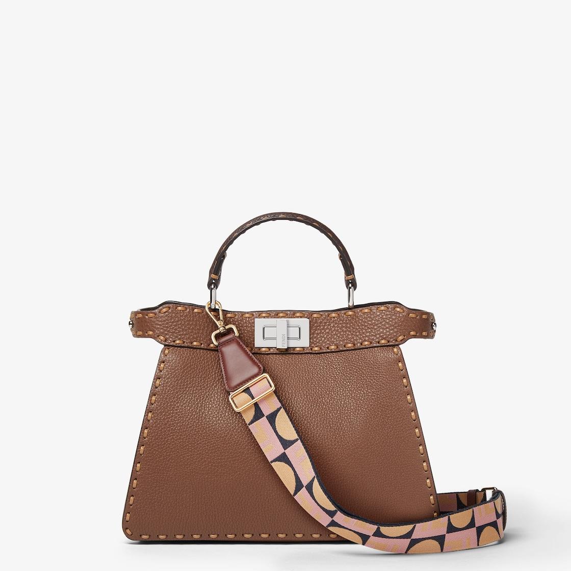 Long adjustable shoulder strap with double clip, to use in combination with any bag with hooks. Made of pink jacquard webbing with Fendi Dots motif, a combination of the iconic FF and Art Deco-inspired dots in different colors. Embellished with details in brown leather. Gold-finish metalware. Made in Italy