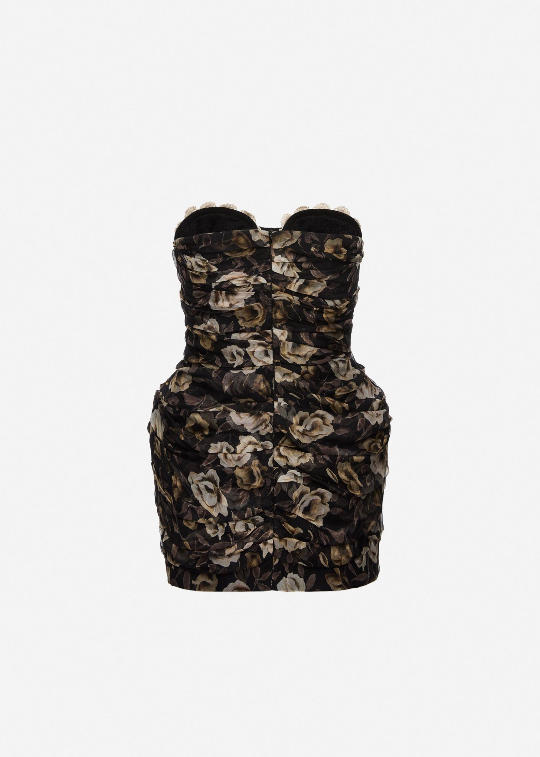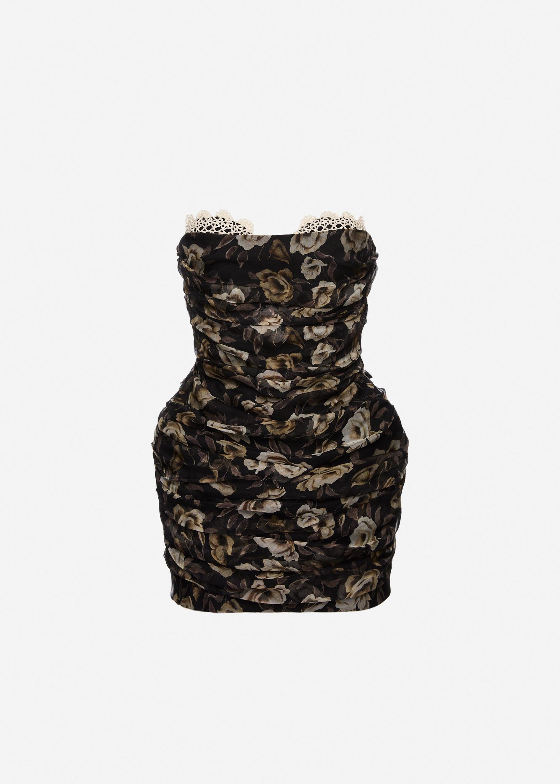 Strapless ruched silk mini dress in black print