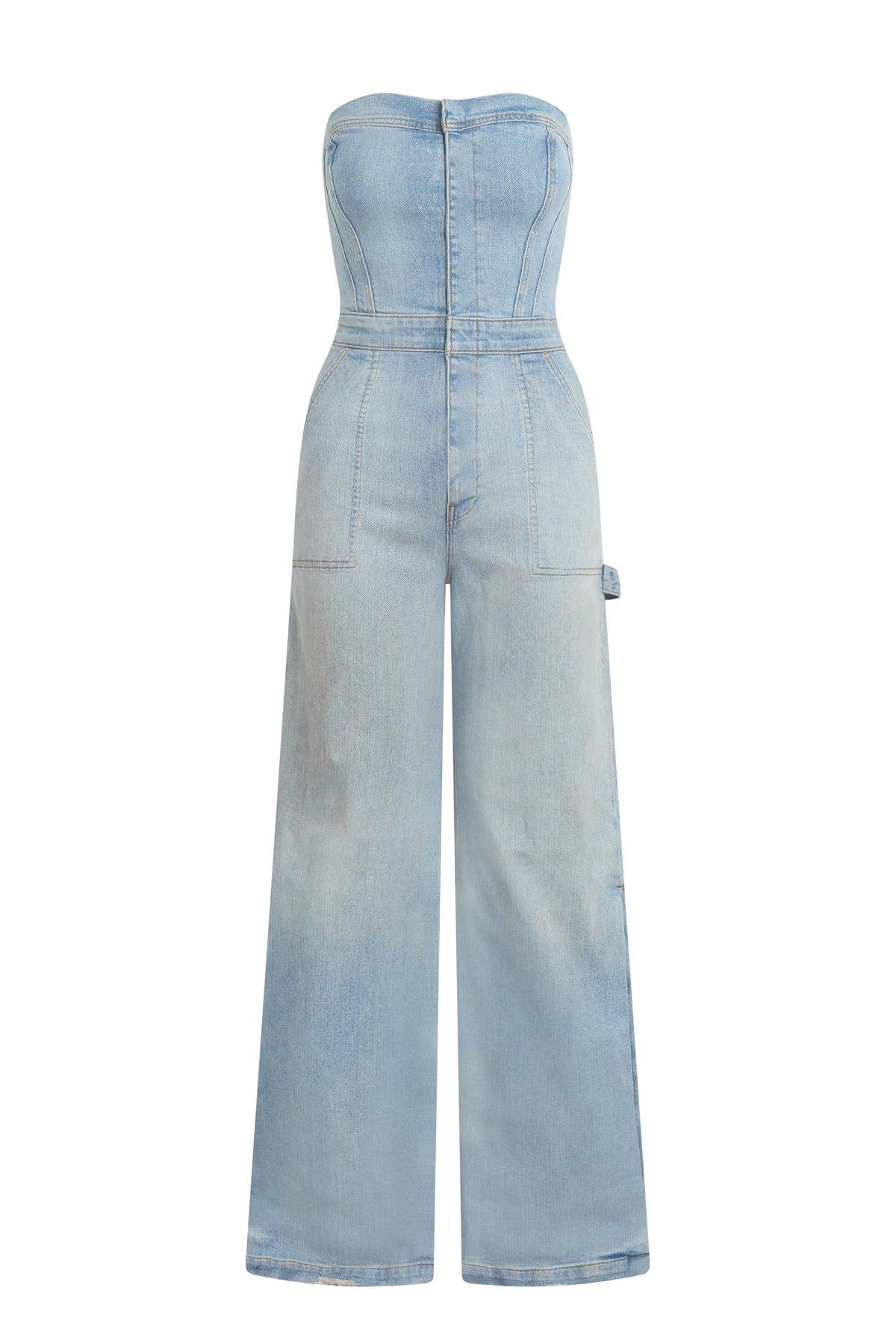 Description The Strapless Wide Leg Jumpsuit in Tough is a our one-and-done jumpsuit, featuring mixed carpenter detailing and a flattering silhouette. It is made of a comfort stretch denim in a light indigo wash. The jumpsuit is finished with a center front zipper for entry, strapless styling, a hammer loop at back and side snaps down the legs. Product Details Front Rise: 13.75", Leg Opening: 24", Inseam: 32", Chest: 32"Model Height 5'9"Model wearing size 25/SMeasurements based on size 27/S Fit & Care Content: 95% Cotton, 3% Elasterell-P, 2% Elastane Machine wash cold gentle cycle Only non-chlorine bleach when needed Tumble dry low Medium iron if needed