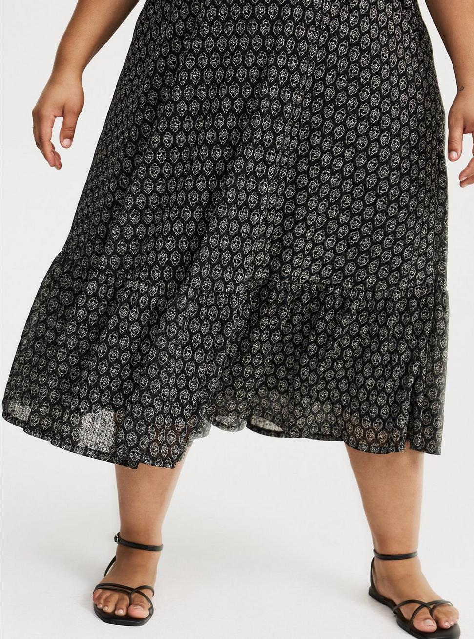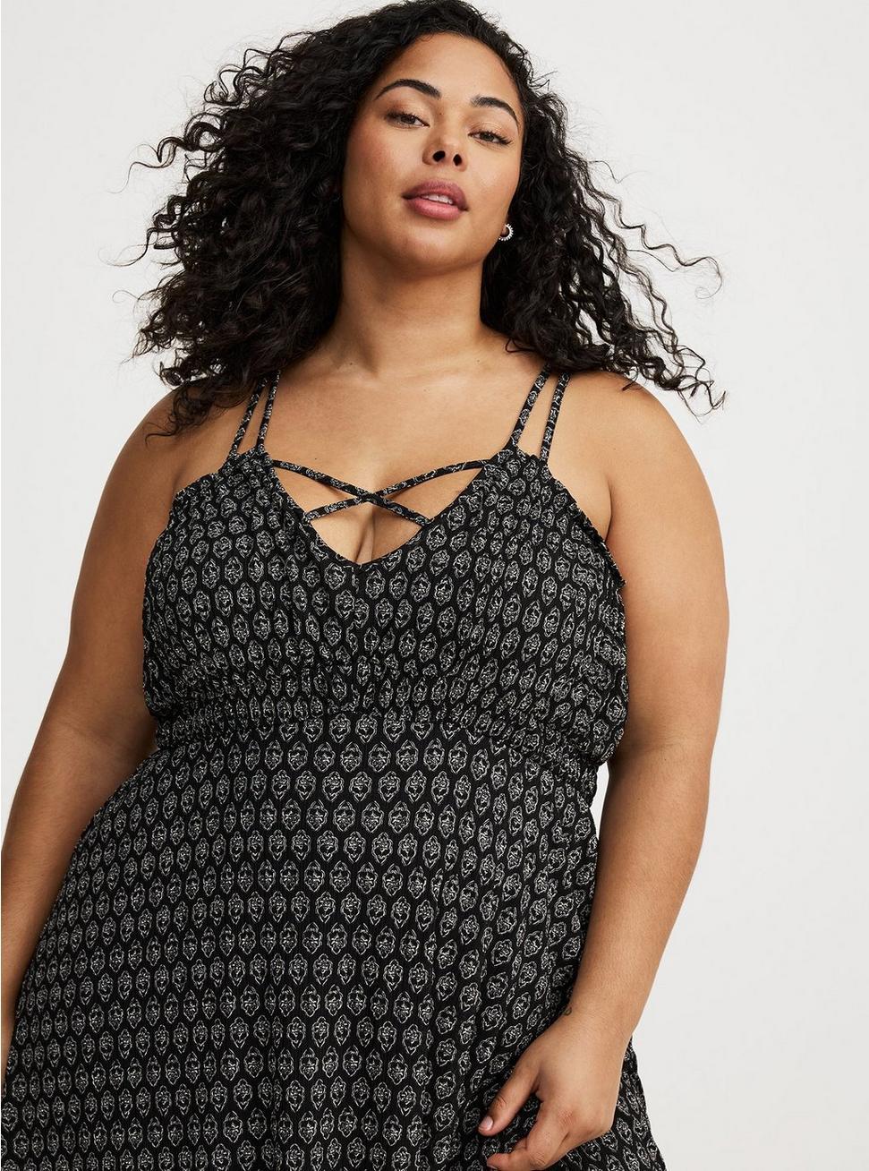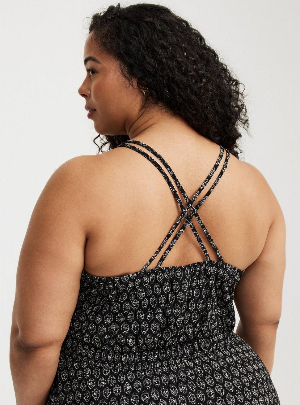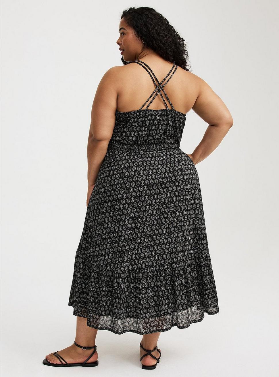 FITMeasures 52'' from shoulder (size 2).MATERIALS + CAREGauze woven fabric: A subtly sheer, lightweight, breathable and soft fabric that belongs in your closet ASAP. 100% polyester. Machine wash cold. Tumble dry low.Imported.DETAILSV-shaped neckline. Sleeveless. Dual straps. Tiered skirt.Functional pockets. Criss-cross front.