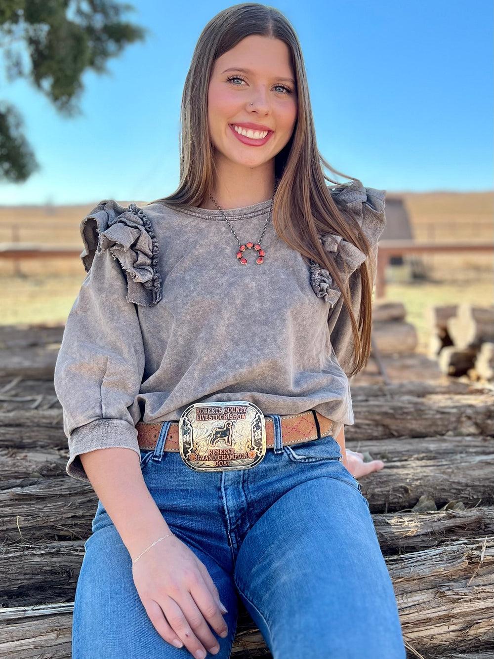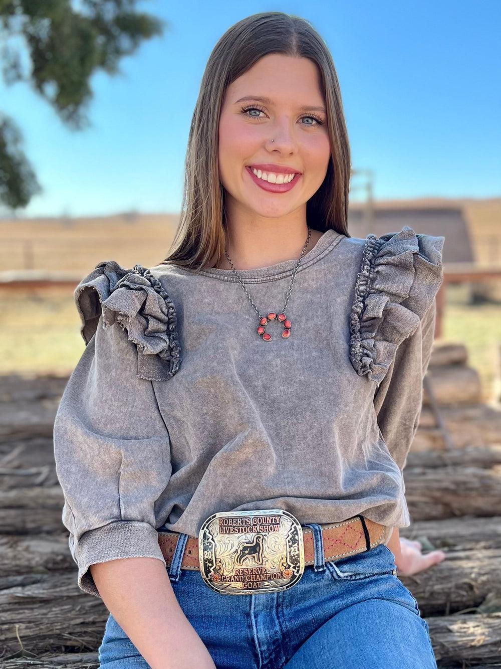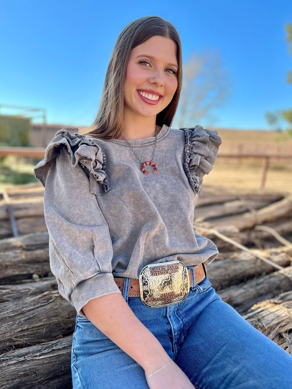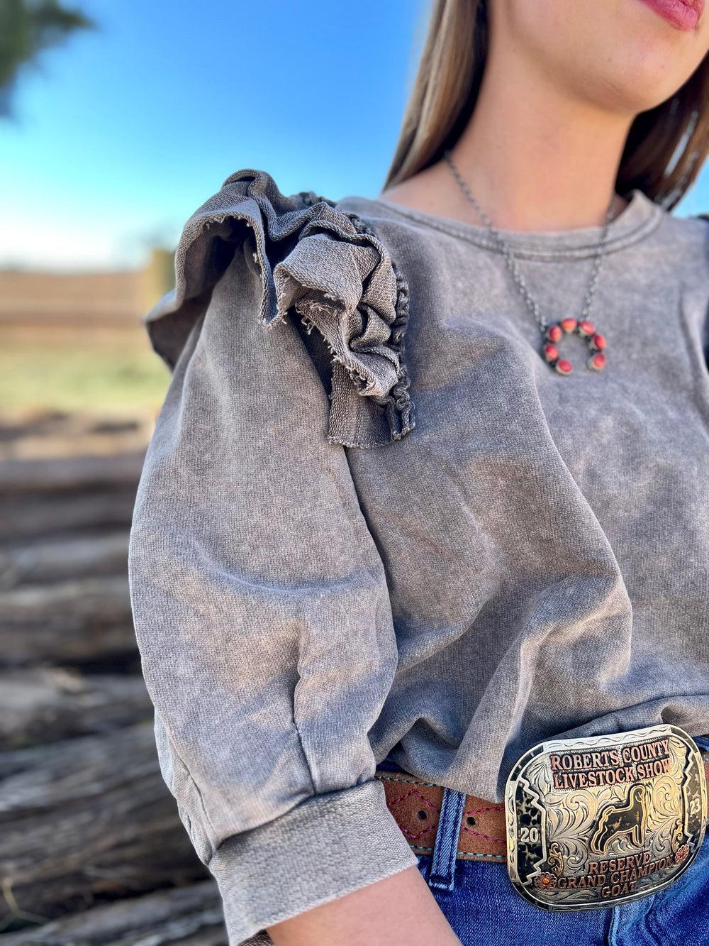 This Stratus Mineral Washed Top brings together classic style and modern charm with a charcoal boxy cut French Terry material enhanced with a mineral wash. Its unique double ruffle 3/4 sleeves add a fashionable touch while the garment's fabric ensures comfortable wear. Perfect for creating a casual look, or dress it up for a more glamorous outfit. True to size