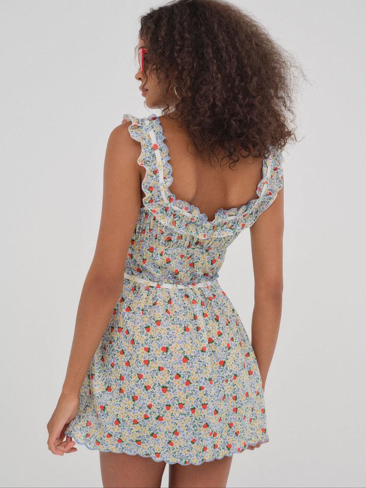 Made for days in nature, the Strawberry floral mini dress is both short and sweet. This ruffled mini dress is crafted in a lightweight floral and strawberry printed cotton, and features gathered details at neckline and waist. It's adorned with embroidered scalloped edges and a ribbon slotted trim.