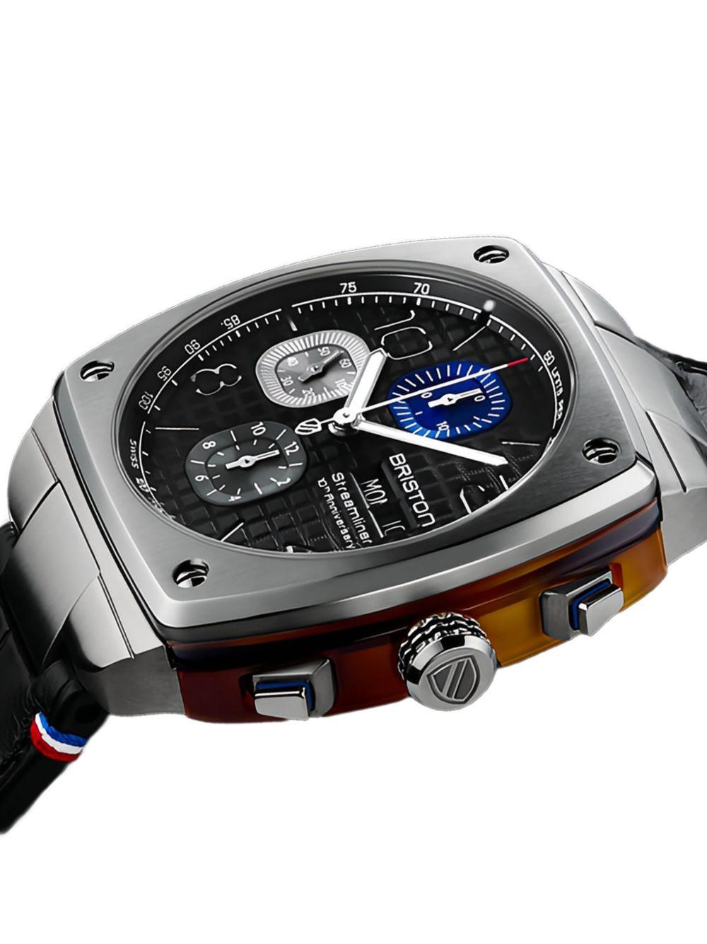 Briston Streamliner Urban 10th Anniversary 43mm | Black | black | 43mm | stainless steel case | carbon fibre dial | chronograph sub-dials | tortoiseshell resin bezel | swiss automatic movement | This item comes with a standard one-year warranty from the brand. | Sapphire Crystal/stainless steel/Cellulose Acetate/Calf Leather | Chronograph Watches | Fine Watches | Watches | Men