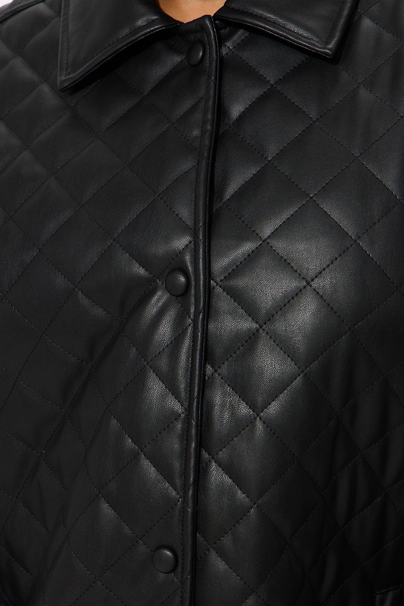 Available In Black. Faux Leather Coat Collar Neckline Long Sleeves Button Closure Quilted Pockets Fully Lined Self Coating: 100% Polyurethane Self Backing/Lining/Filling: 100% Polyester Imported California Proposition 65WARNING: Cancer and Reproductive Harm - www.P65Warnings.ca.gov.
