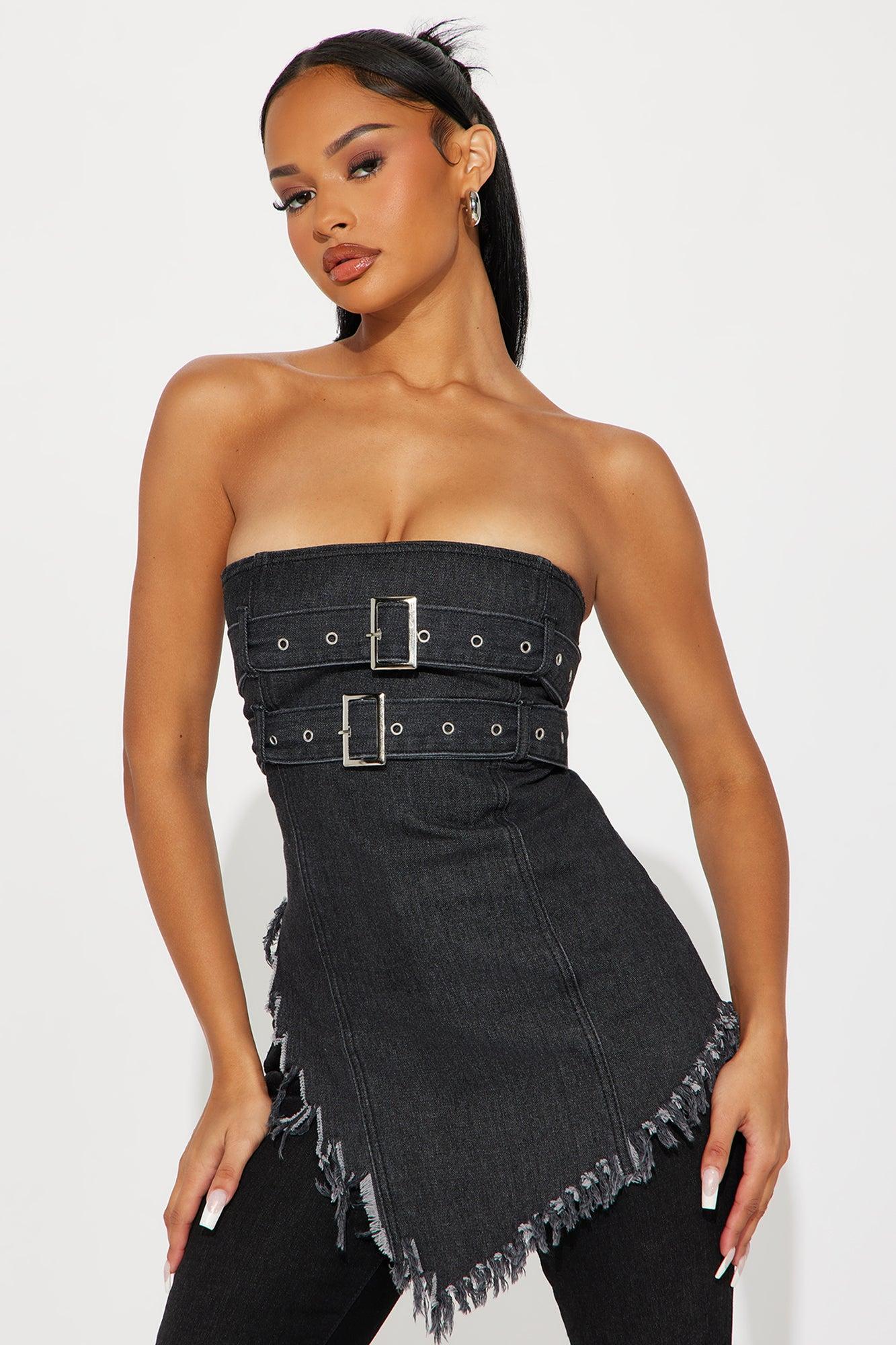 Available In Black Wash. Denim Tube Top Strapless Belted Details Asymmetrical Raw Hem Back Zipper Closure Non Stretch Disclaimer: Due To The Specialized Wash, Each Garment Is Unique. Shell: 72% Cotton 28% Polyester Imported