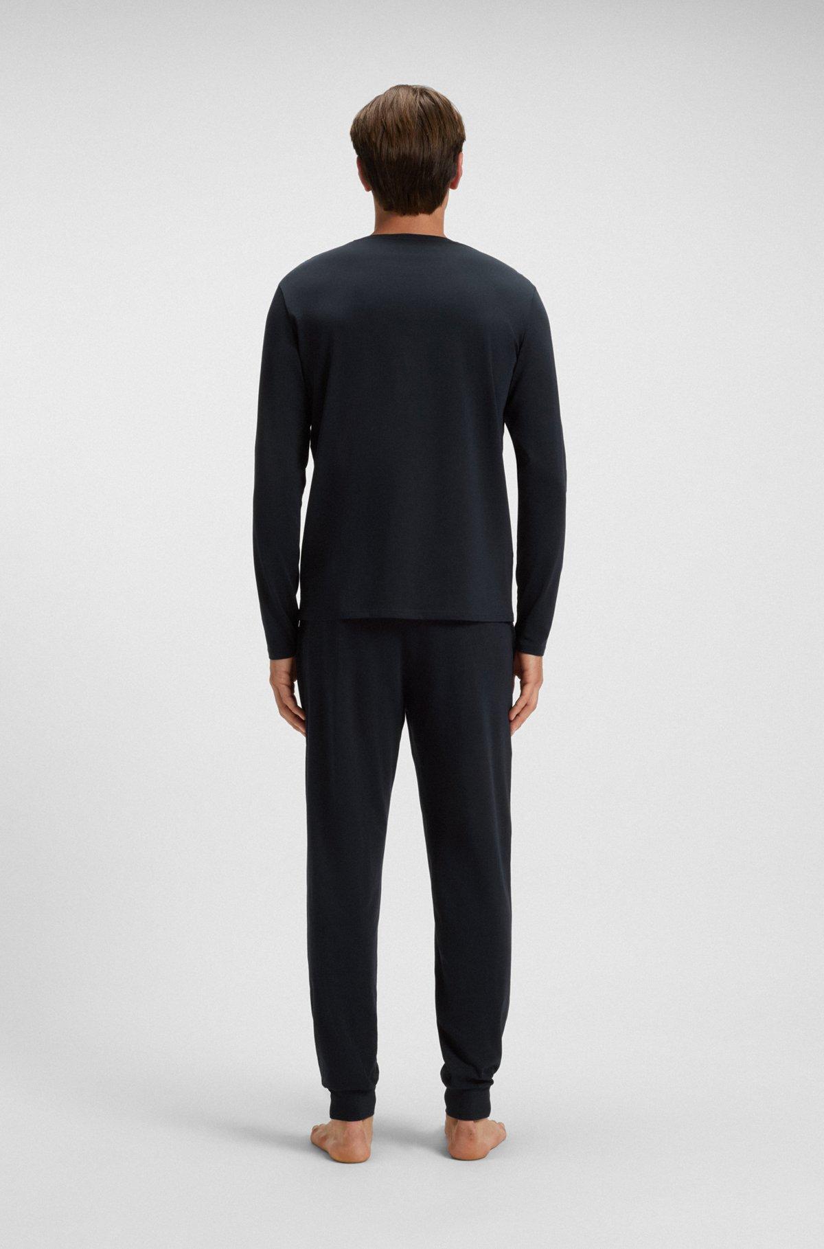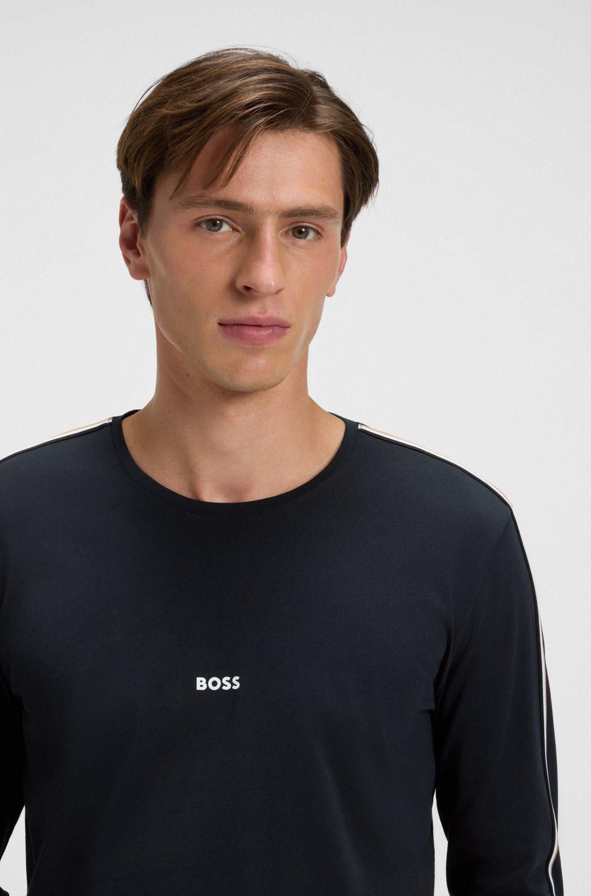 Relax in comfort with the soft stretch cotton of this regular-fit BOSS Menswear pajama top. Contrast logo and signature-stripe tape.