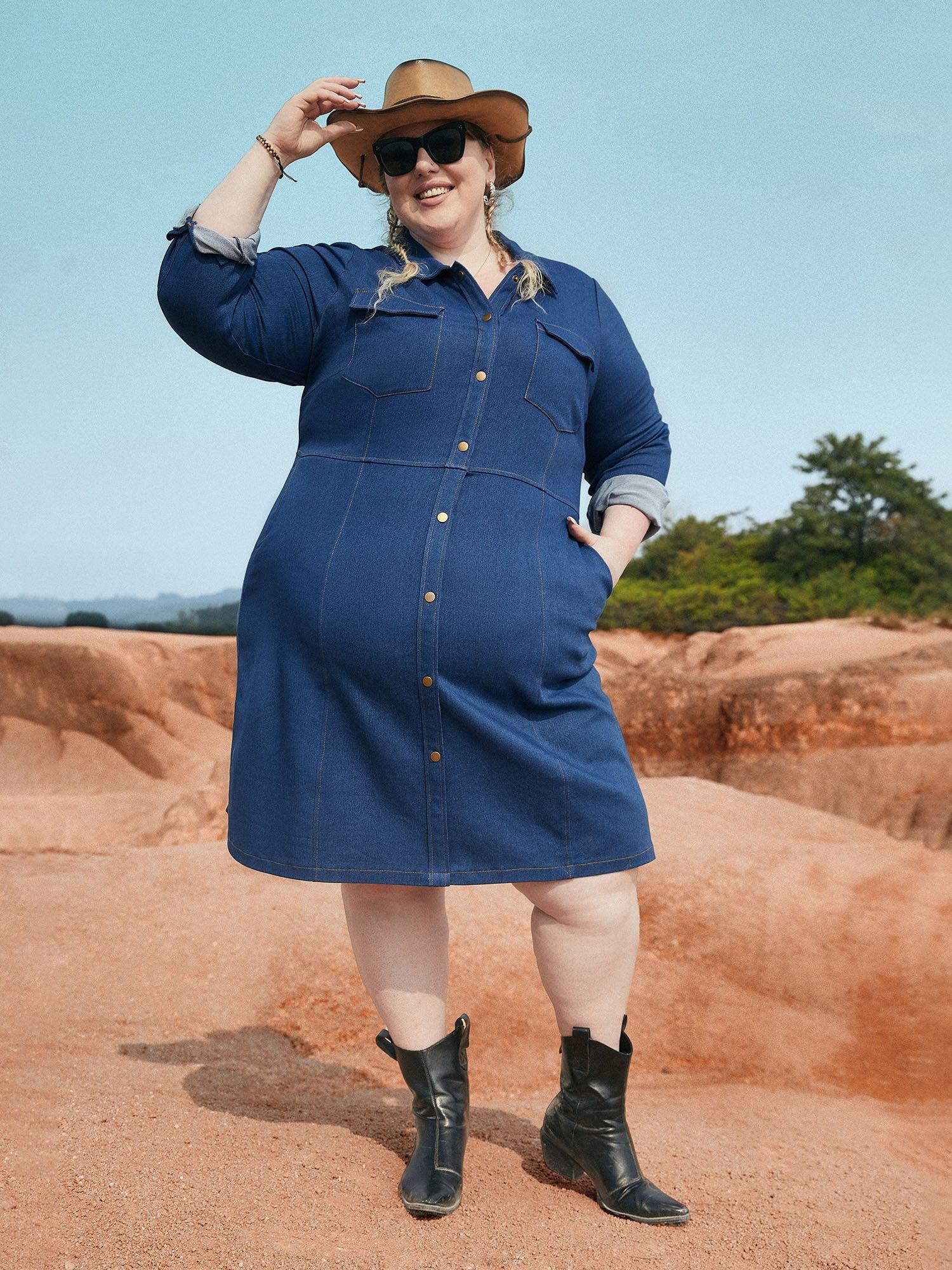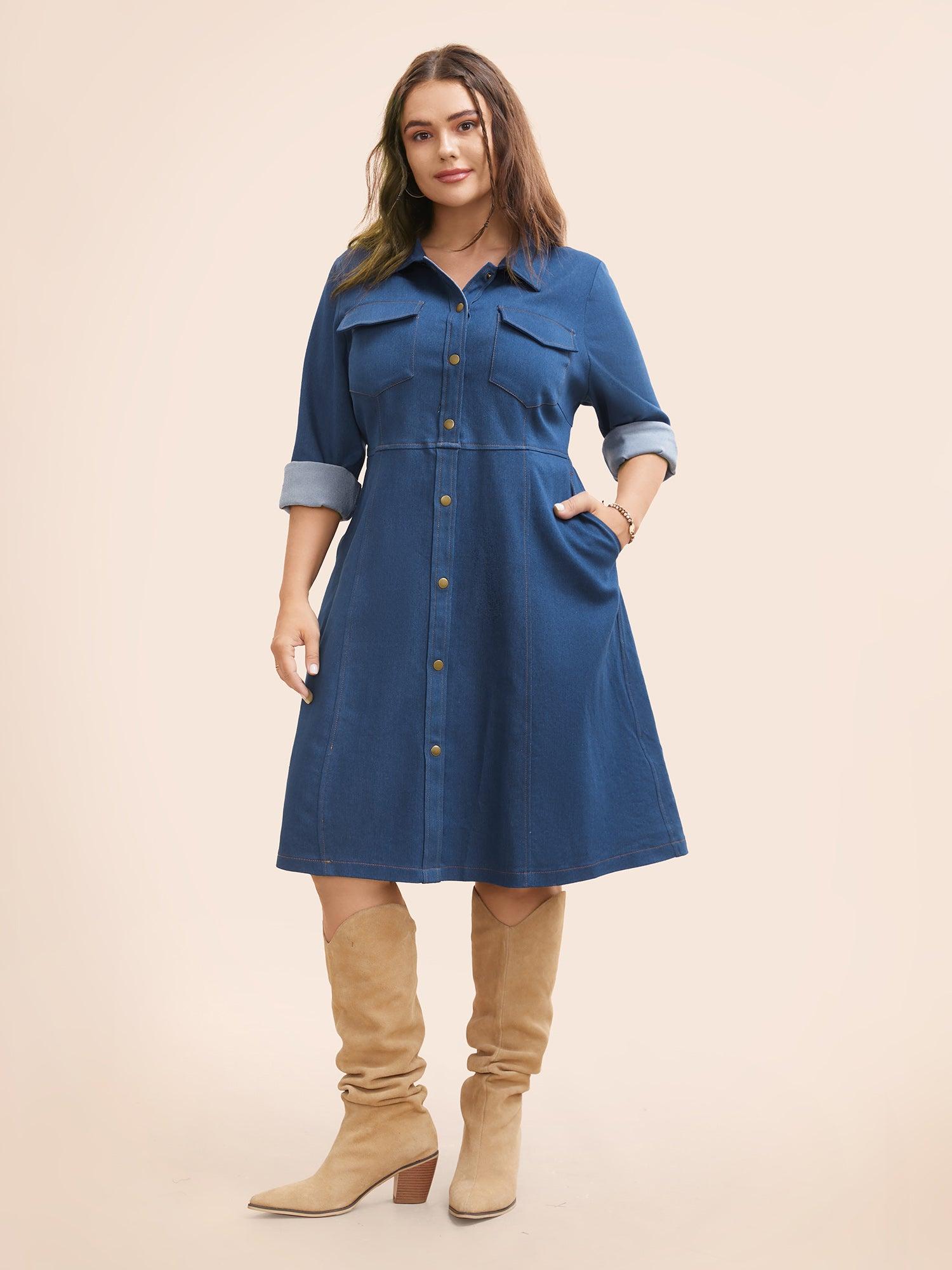 Stretch Denim Chest Flaps Waist Defining Midi Dress Female