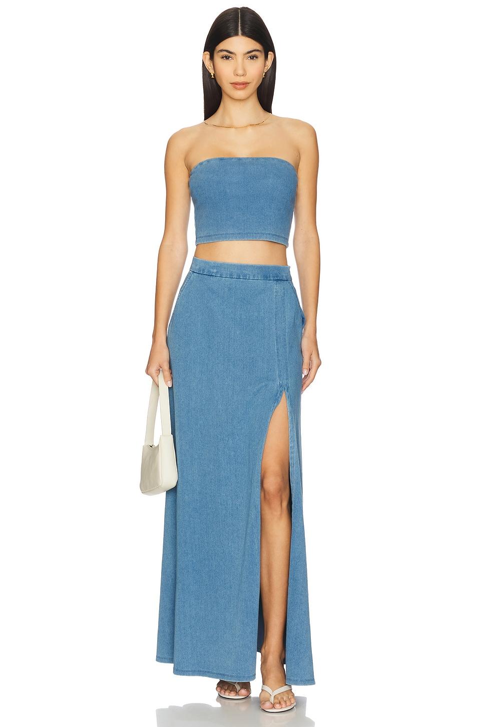 59% cotton, 29% polyester, 12% elastane. Machine wash cold. Unlined. Hidden side seam zipper closure. Side slant pockets. Midweight ultra-stretch denim-blend fabric with side hem slit. Item not sold as set. Skirt measures approx 41.5" in length. Made in Vietnam. Revolve Style No. SUSA-WQ128. Manufacturer Style No. 0425ddks00124.