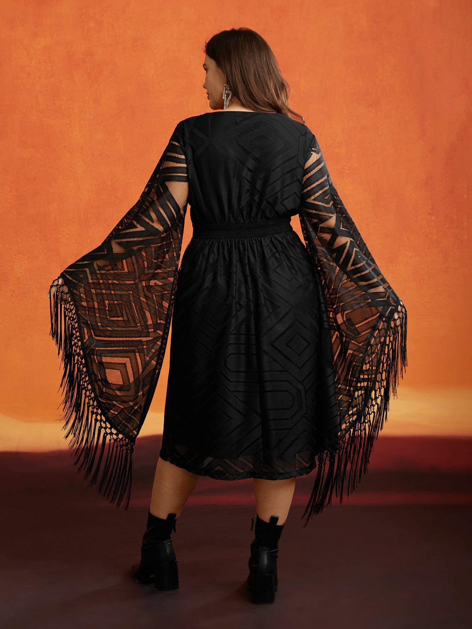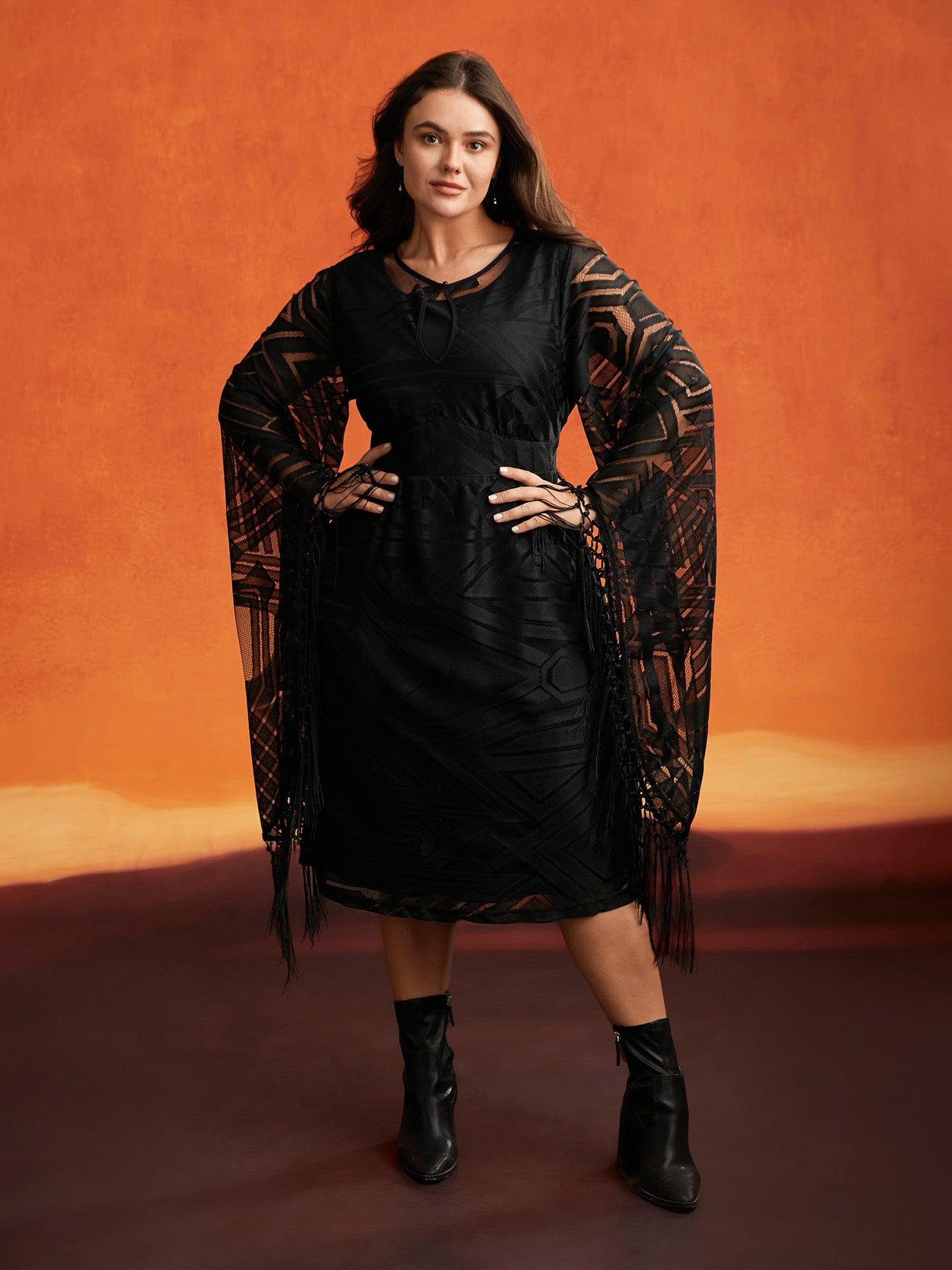 Shop Stretch Fabric Bell Sleeves Midi Dress now and redefine your style with confidence at BloomChic. Tailored for mid and plus-size women. This trendy Dresses Women, sizes 10-30. Season:Winter;Color:Black;Style:Cocktail;Neckline:Round Neck;Sleeve Type:Bell Sleeve;Prints:Synthetic texture;Details:Tassels, Texture, See through;Pocket:No-pocket;Belt:No-belt;Closure Type:Non