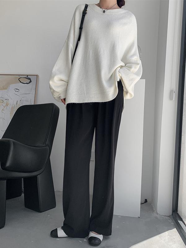 Stretch Mohair-Blend Balloon Sleeves Loose Solid Round-Neck Sweater Tops