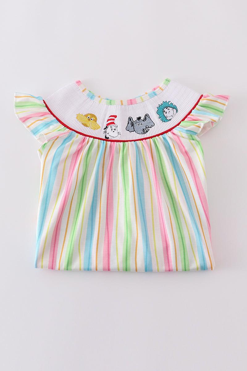 Bring some whimsy to your wardrobe with our Stripe Dr. Seuss embroidery smocked dress. The playful combination of stripes and Dr. Seuss characters will make you stand out wherever you go. Plus, the smocked design ensures a comfortable and flattering fit. (Who needs a waistband anyway?!) Perfect for a fun and carefree day out. (No green eggs or ham required.)