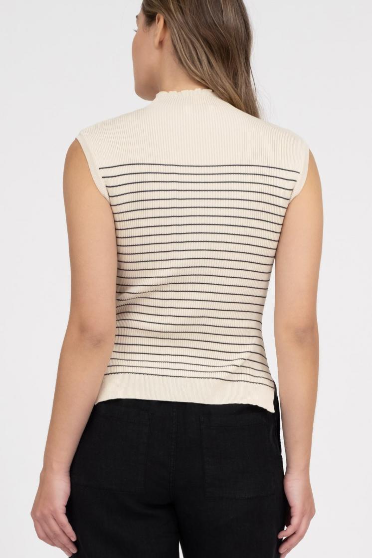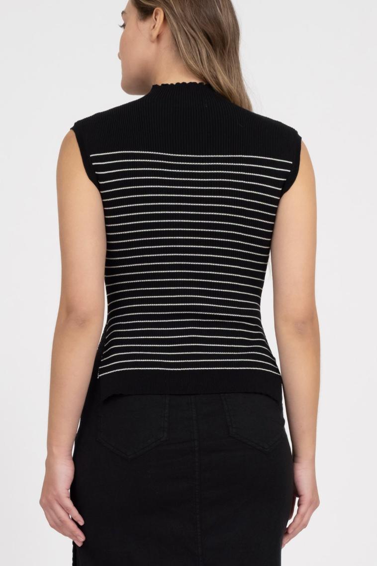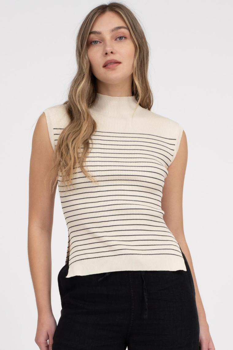 The Stripe Mock Neck Sleeveless Side Slit Sweater has a modern yet timeless appeal. The stripe pattern of this sweater adds a classic look with the sophistication and sleekness a the mock neckline. Side slit design gives a contemporary and relaxed silhouette.