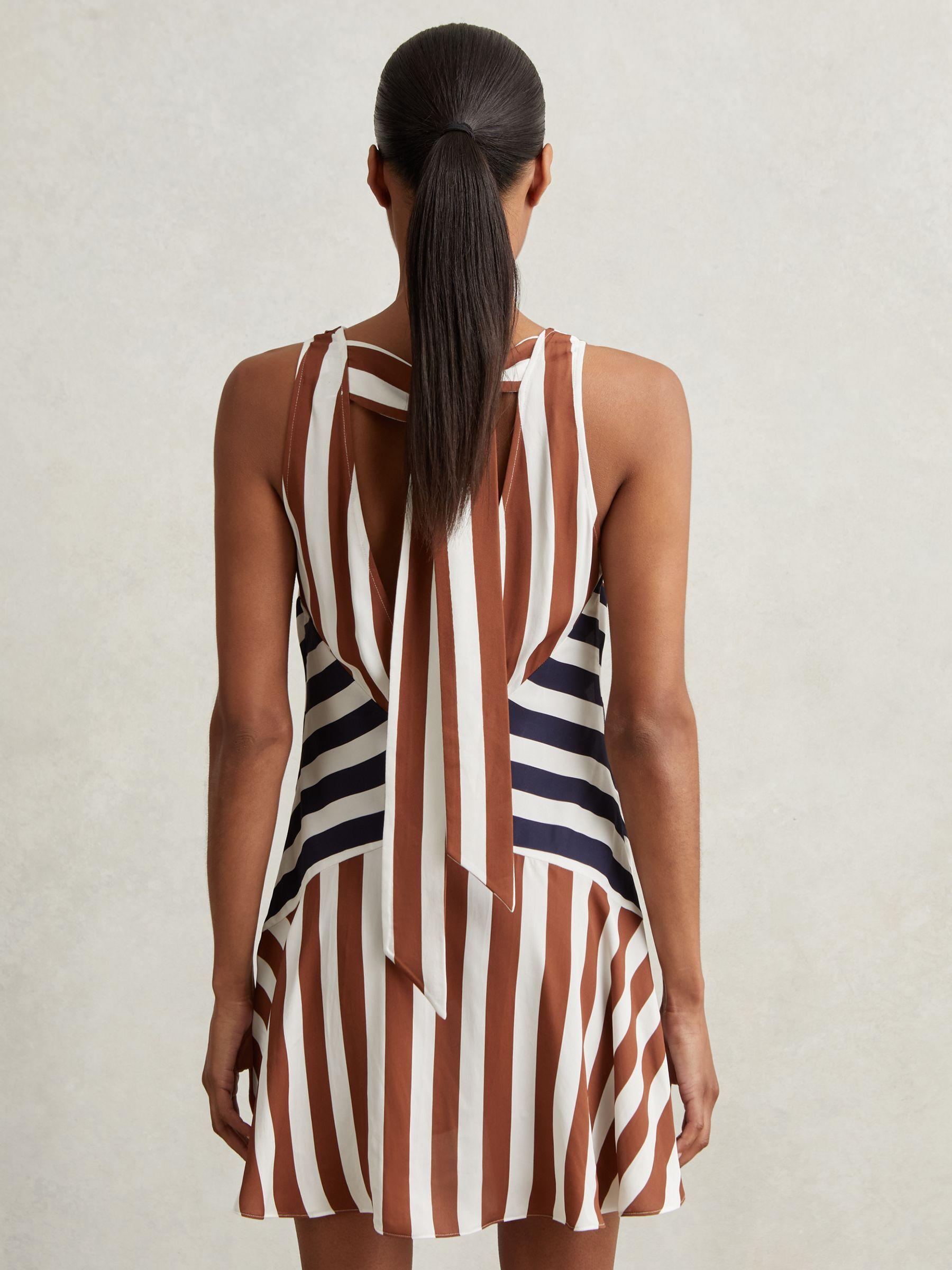 The Esme mini dress is defined by bold striped panels and a flattering plunge neckline. A self-tie at the back adds a feminine touch, while the flared skirt creates effortless movement. Striped panels Plunge neckline Self-tie back Flared skirt Concealed side zip