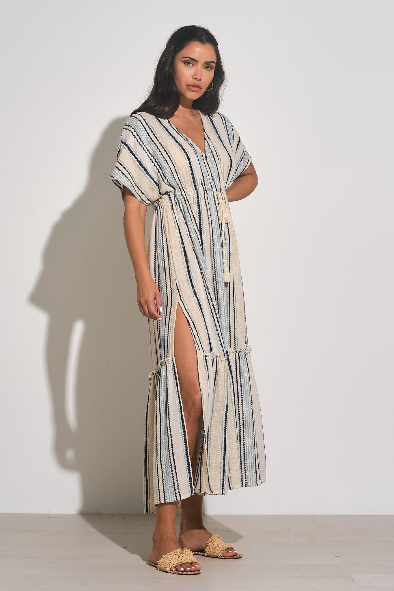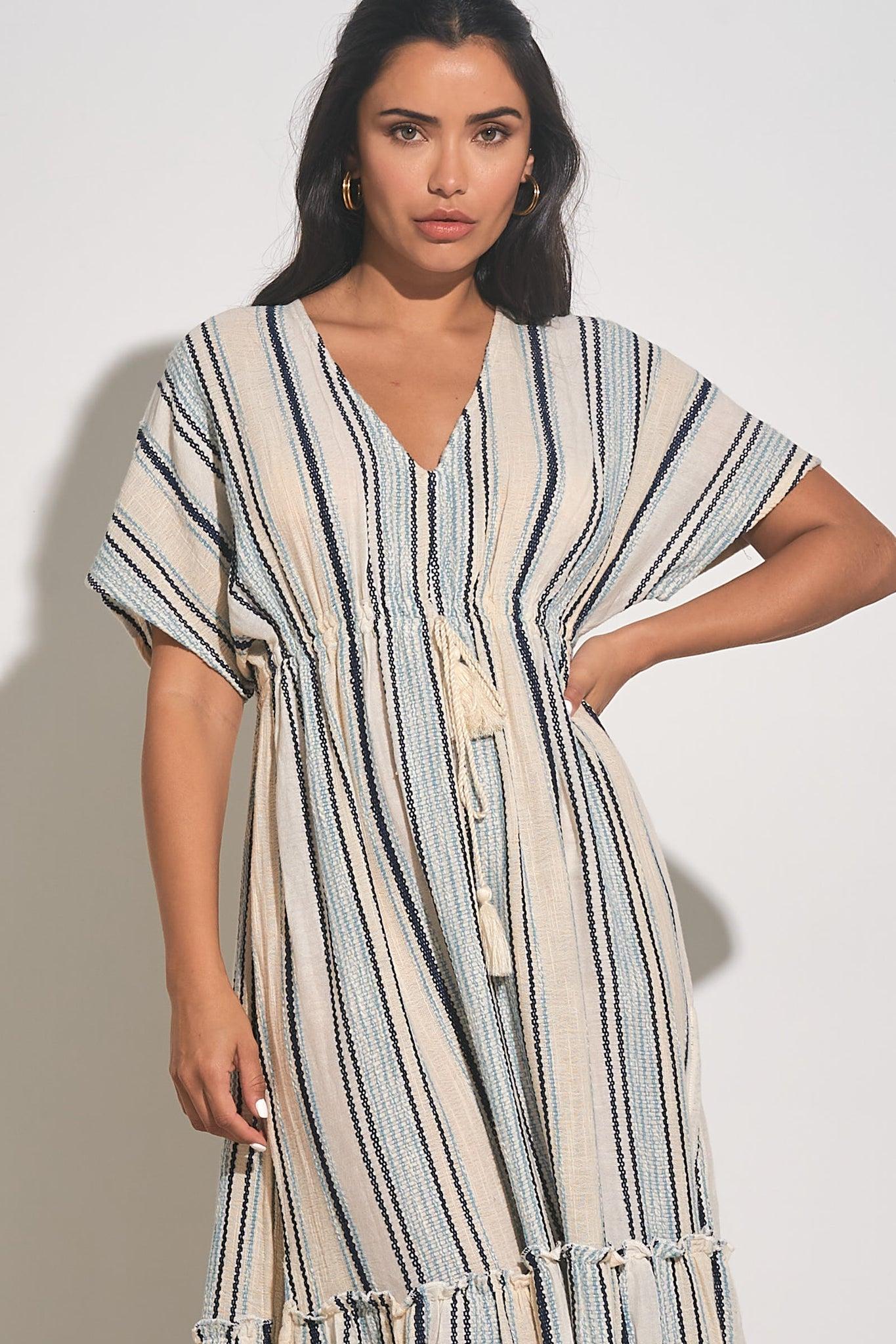 Get summer-ready with the Stripe Ruffle Maxi Dress. Featuring a stylish ruffle bottom and a cinched waist with tassels to tie, it’s your go-to for easy, modern elegance. Perfect for any occasion. This dress effortlessly blends comfort and chic style, making it a must-have in your summer wardrobe.