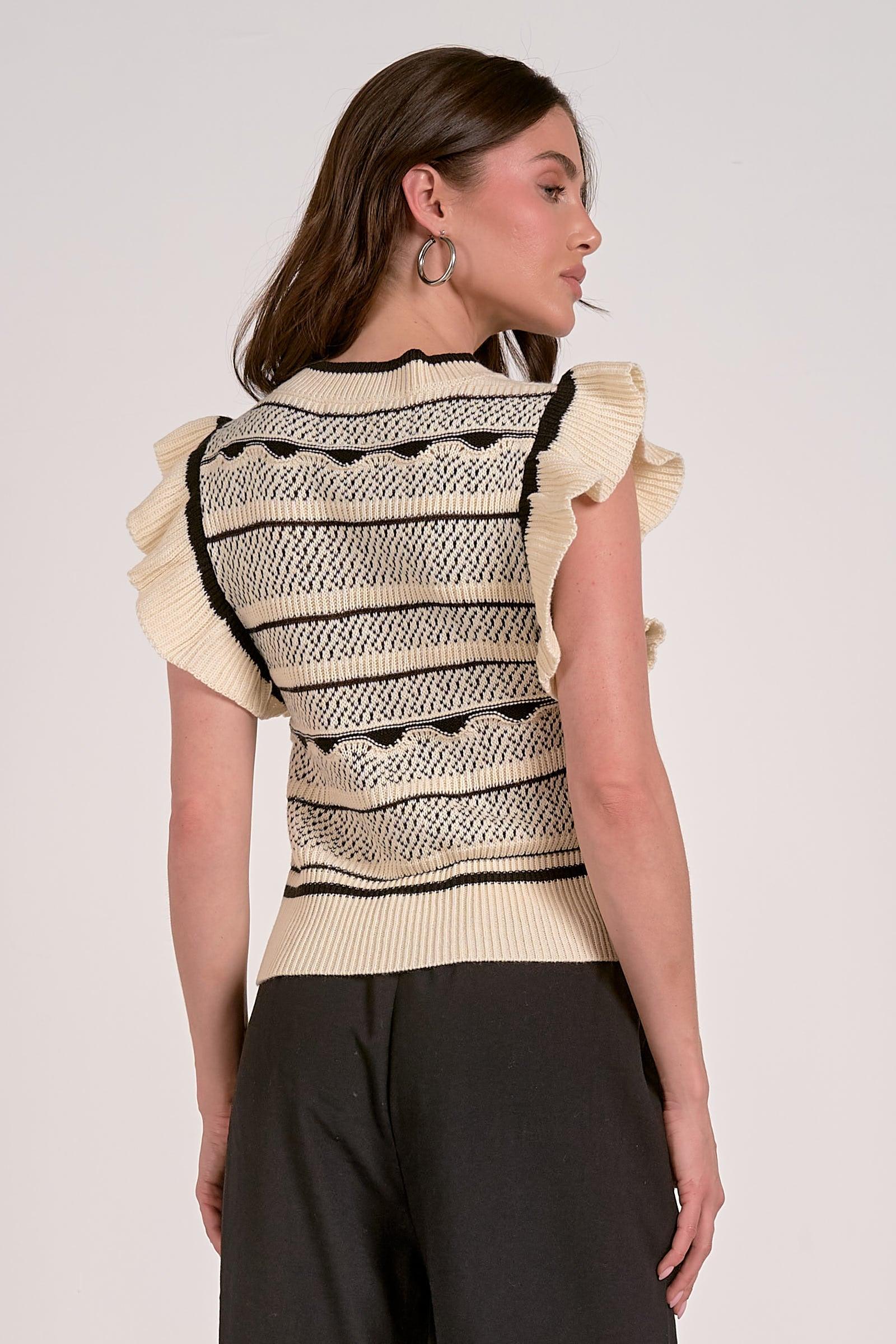 The Stripe Ruffle Sleeve Sweater Tank Top brings a flirty flair to your wardrobe. This knit tank features a flowy, girly cap-sleeve design with a crew neck, accented with a cool knit pattern for a playful touch. Ideal for transitional weather, this piece offers the perfect blend of comfort and style, perfect for layering or wearing on its own.